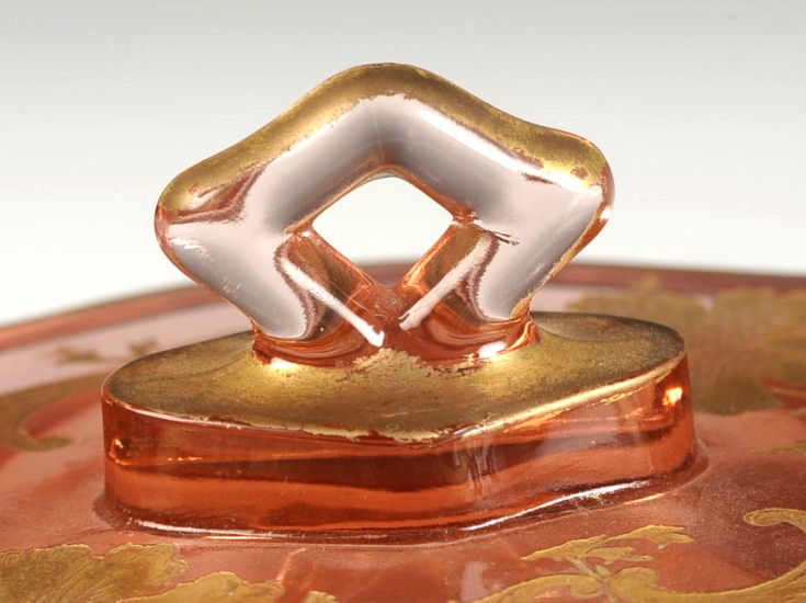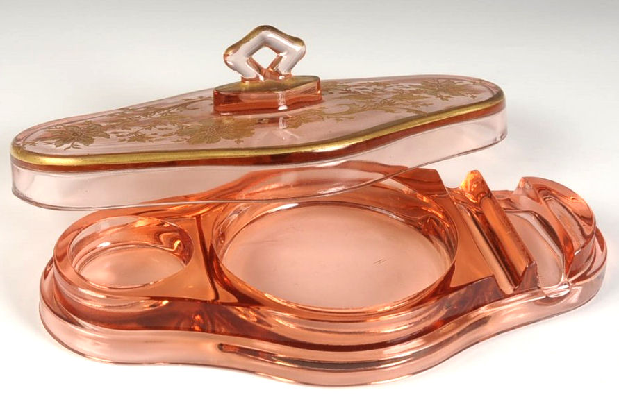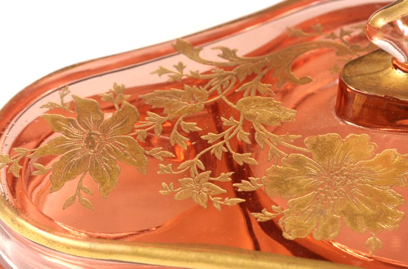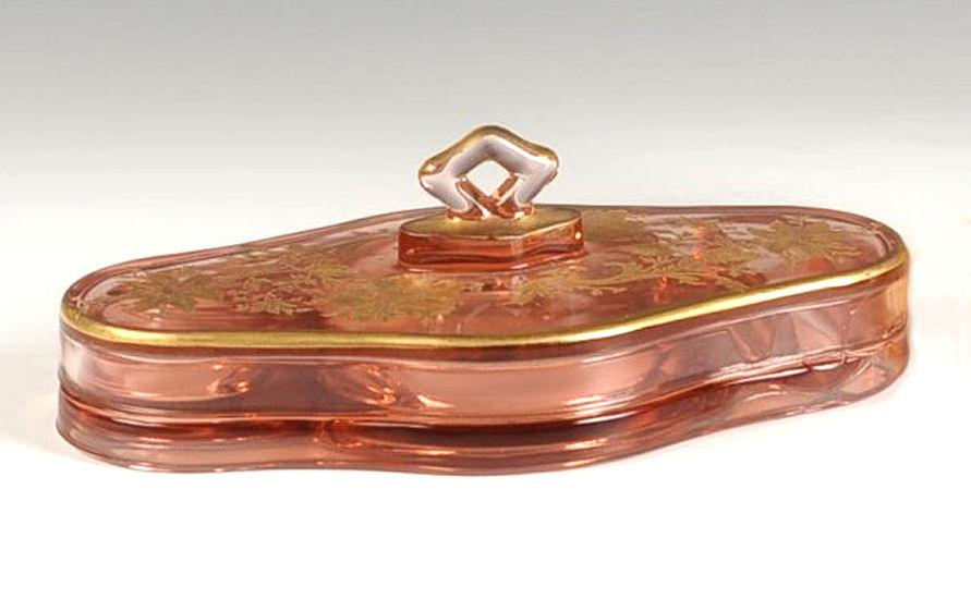 This is a truly gorgeous covered vanity tray made in 1926 by Cambridge ... I have seen it before with plain tops but this one is exquisitely etched and gilded in gold ... it is truly beautiful! The lid lifts off to reveal a compartmented interior with a powder in the center, rouge pot on one side, and lipstick and eyebrow pencil slots on the other. Referenced in the "Bedroom & Bathroom Glassware of the Depression Years", it states " ... is 4-3/4" wide and 8-1/2" long and was introduced by the Cambridge Glass Company in 1926." The bottom is marked on the underside "PAT. APPL'D FOR". This is a substantial piece and weighs over 2 lbs. ... it is in excellent condition with some minor age appropriate wear to the gold on the handle and edge and one very small fleabite on the INSIDE rim of the lid. This is a rare and fantastic piece! (Click on pic for more photos.) |