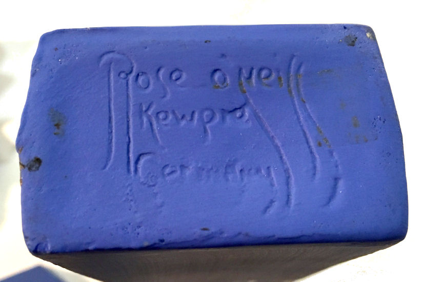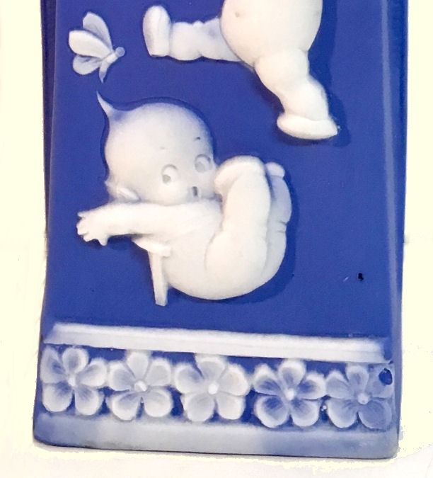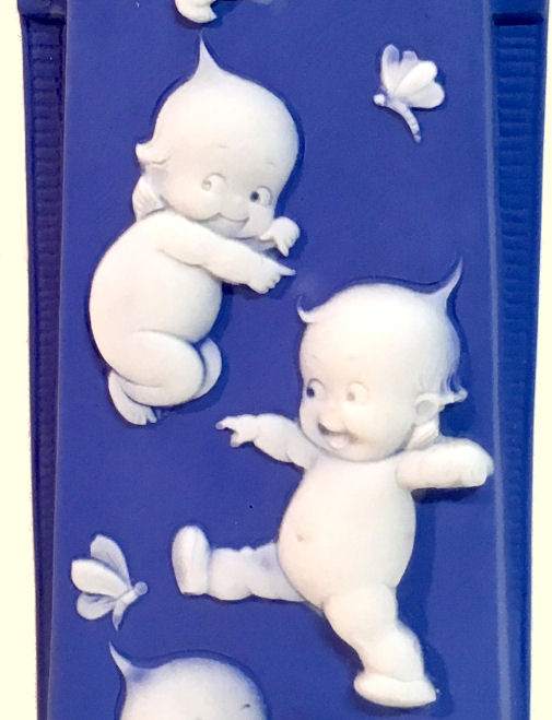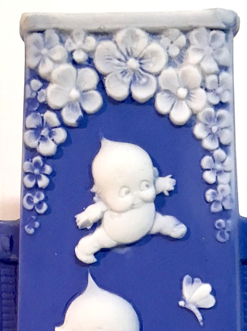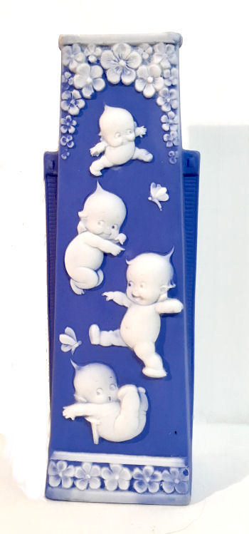 This gorgeous high-relief jasperware vase is done in Wedgwood blue and is just stunning! Four little frolicking kewpies tumble about the front with butterflies and flowers. It is signed on the base "Rose O'Neill Kewpies, Germany". It is in excellent condition with two tiny air bubbles on the top rim which I believe are factory original. This could also be used to hold long hatpins. Measures 2-1/4" x 1-1/2" (at the base) x 6-5/8" high. (Click on pic for more photos.) |