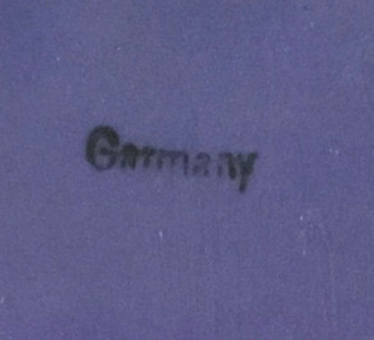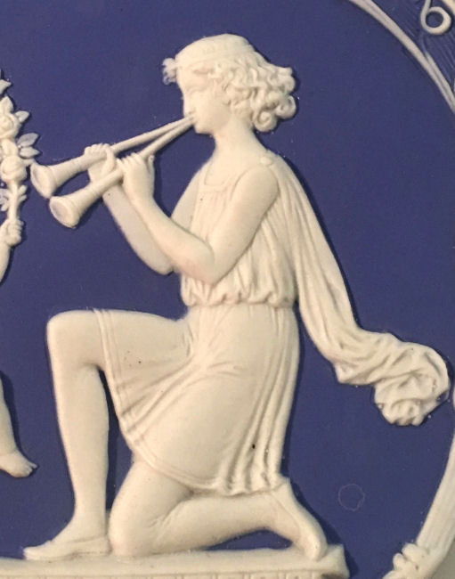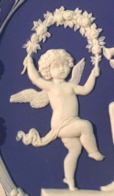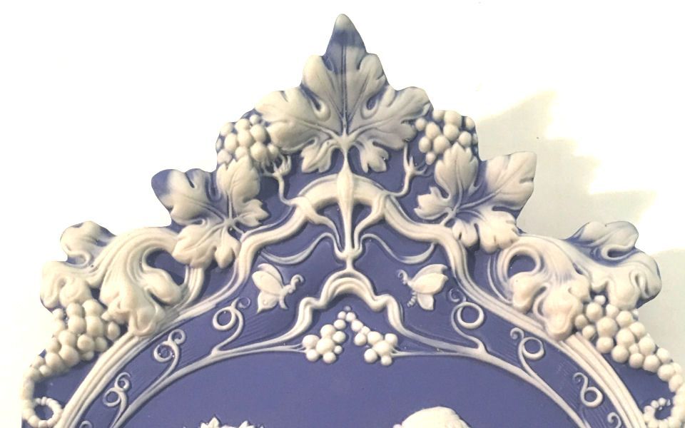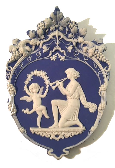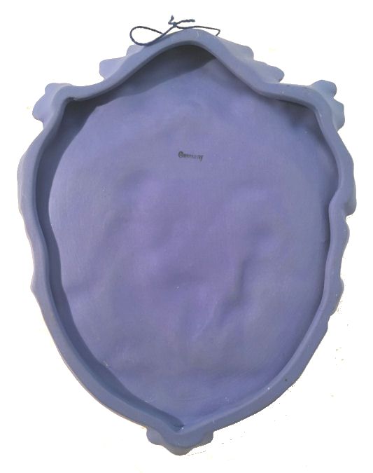 This beautiful jasperware plaque (which could be used as a dresser tray) is done in Wedgwood blue and so ornately detailed! The lovely musician is playing two horns and a little cupid is dancing with a floral garland. The top is adorned with gorgeous grapes and vines and leaes in so much detail ... truly a stunning piece. The shaping of the plaque is also very ornate. There is a little cord at the top for hanging if you wish or use on the dresser to hold pins or small trinkets (although it was be a shame to cover this up!). It is in absolutely mint condition and is signed "Germany" on the back. Measures 7-1/4" x 5-1/2" at widest points. (Click on pic for more photos.) |