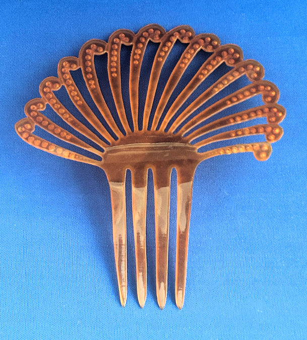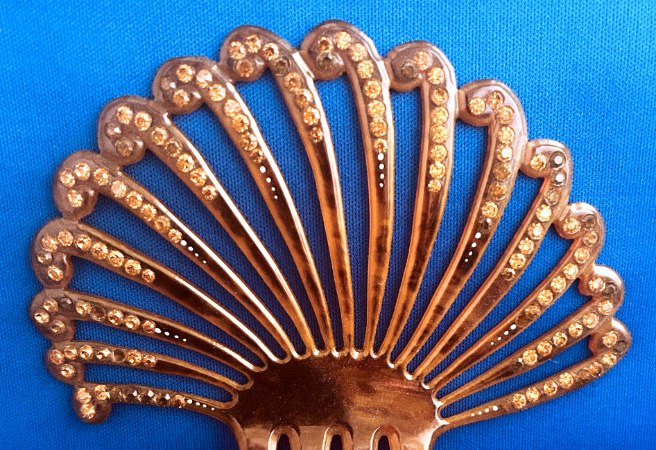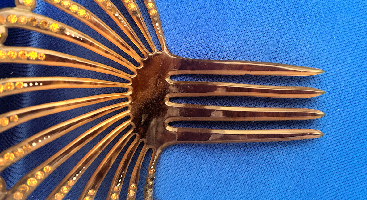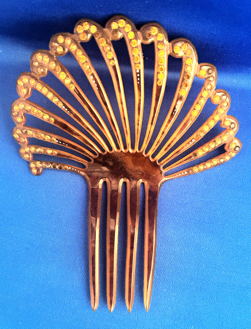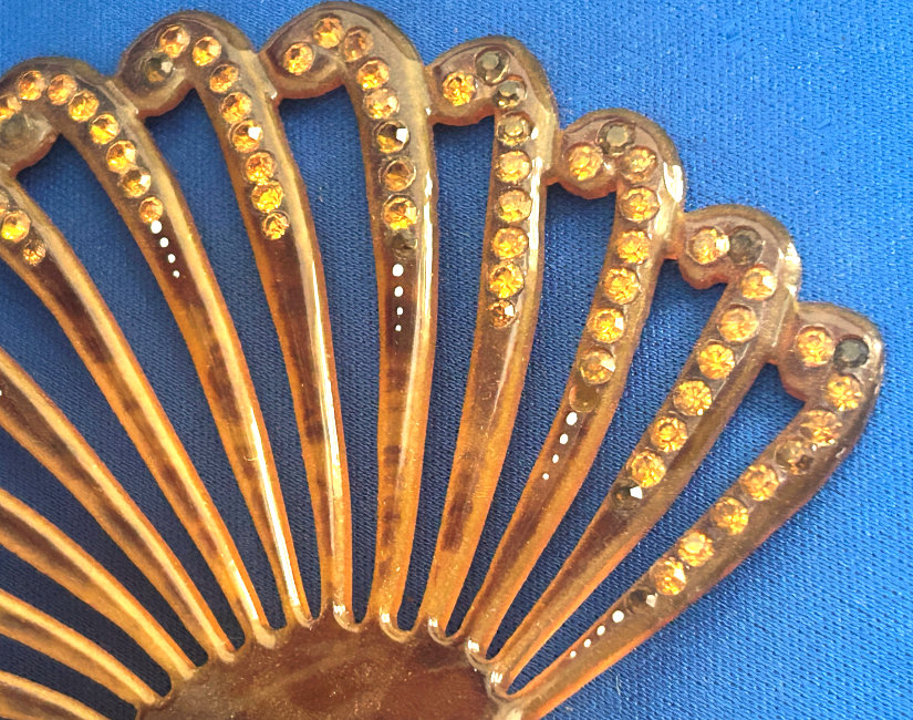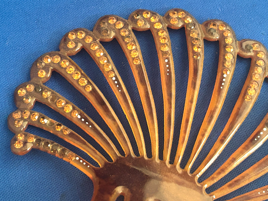 This beautiful faux tortie ornate fan-shaped hair comb boasts dozens of jewels! It was hard getting accurate color photos of this item as it is not as dark as the photos show. It has shades from light caramel to butterscotch colors and is set with topaz jewels and several other darker jewels that I can't identify. All in all there are 130 jewels and only 3 missing. It is a gorgeous hair comb and totally usable if you wish to do that. It measures 4-1/2" wide across the fan and 5-1/4" overall from tip of comb to crown of fan. (Click on pic for more photos.) |