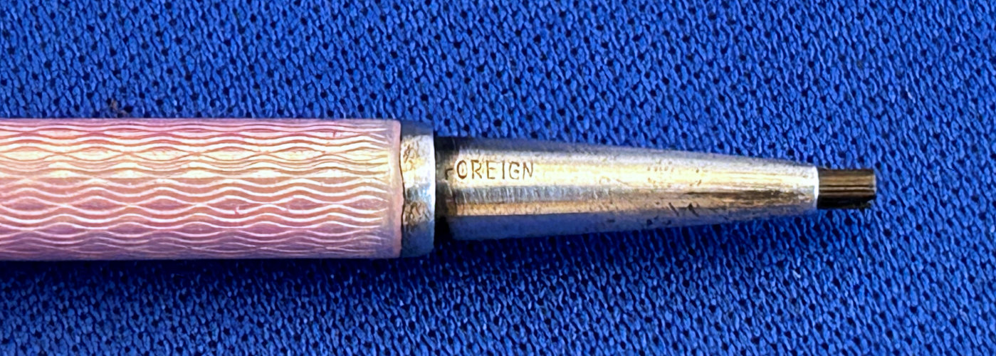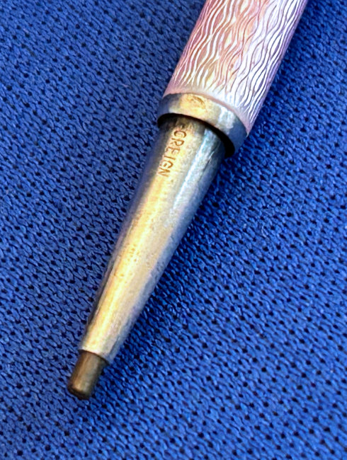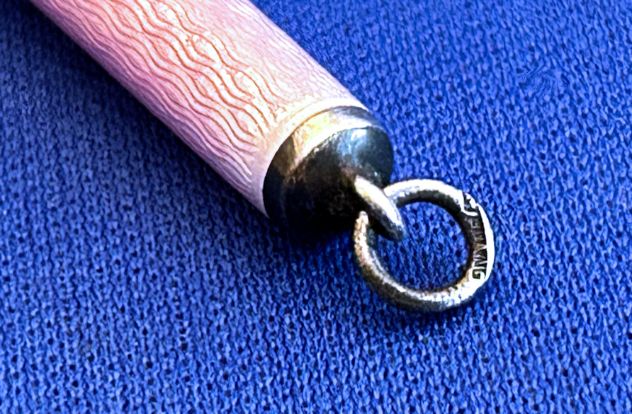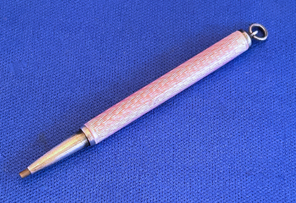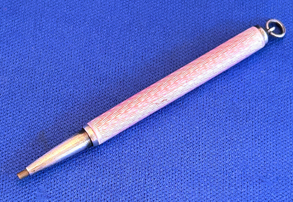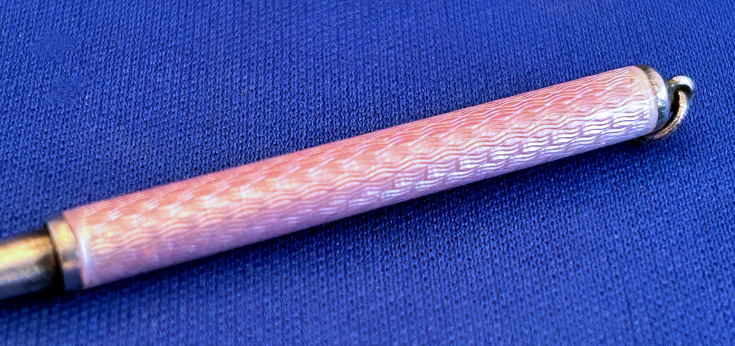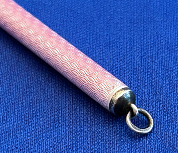 Chatelaines were elegant ways for women to carry utilitarian pieces and this is an exceptionally pretty example that was made for a very fancy chatelaine. It is very tiny ... measures only 2-1/2" long counting the little hanging ring and is only 3/16" diameter. The pencil is done in a very pretty light pink enamel guilloche. The tip turns to extend or retract the lead. It also pulls out so that the lead can be replaced if needed but there is a pretty long piece in there at present. It is marked Sterling on the little ring at the end (which is solid) and the word "Foreign" on the tip which would denote Continental (not a specific country).. Condition is excellent! Perfect size to carry in your purse. (Click on pic for more photos.) |