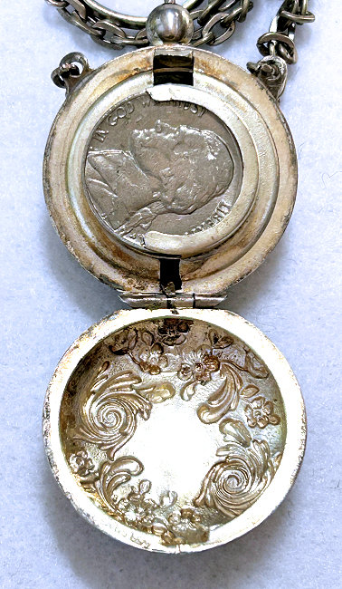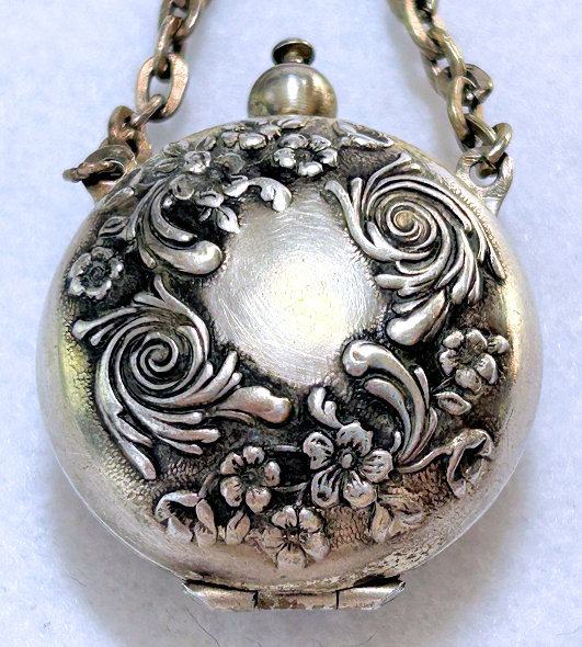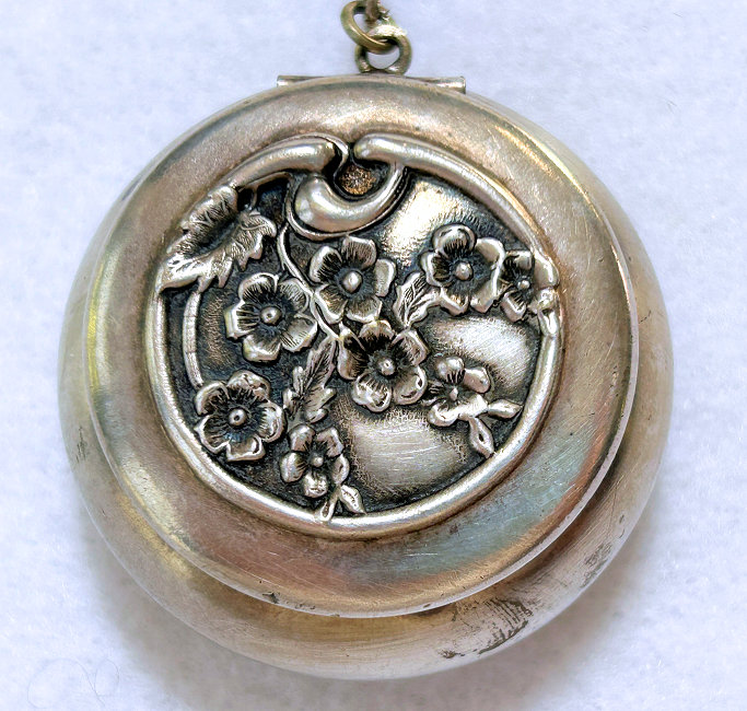 What a stunning chatelaine this is!!! Made of German Silver, it has three original matching pieces: a coin holder, a compact, and a notepad. Just the perfect accessory for an elegant lady dating from the early 1900's. The repousse work is just beautiful and can be found on both sides of the coin holder and notepad. The compact even has a little swansdown puff with a ruched cover and celluloid holder. The notepad four celluloid pages and on one of them is the name and address of the owner and the date "1910". Condition is very good for an item of this age and use ... there is a bump on the ring where there was probably another chain attached which is no longer there. The three pieces that are attached are amazing. Be sure to see all the photos ... there are many!