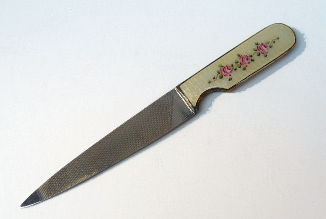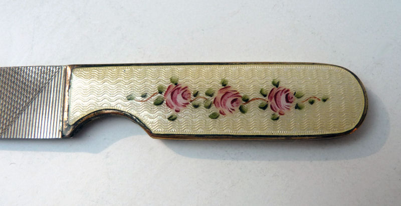 Not only pretty to look at but completely functional is this lovely enamel guilloche nail file. It is a cream color background wih three hand-painted pink roses adorning the end. The enamel is in perfect condition and the file is usable and in very good condition as well. Measures 4-1/2" end to end with the enamel portion being almost 2" x 1/2". Pretty enough to leave out on your dresser! (Click on pic for more photos.) |