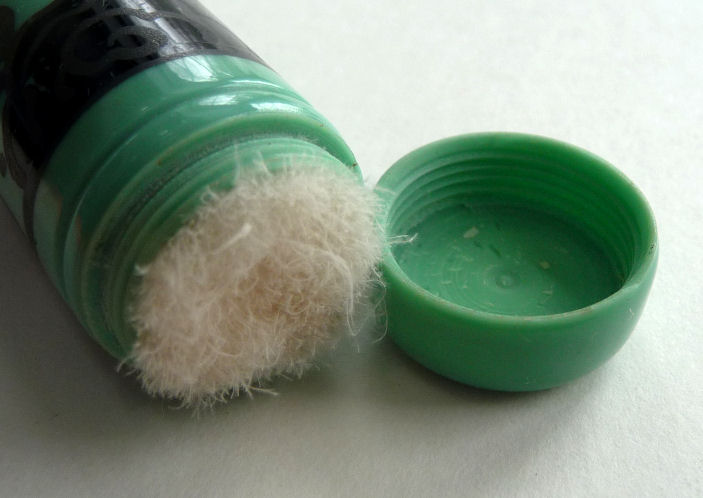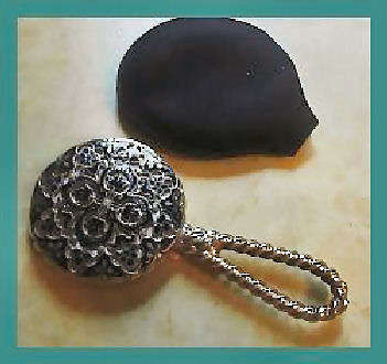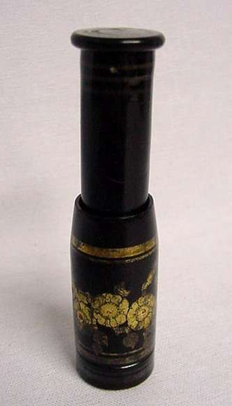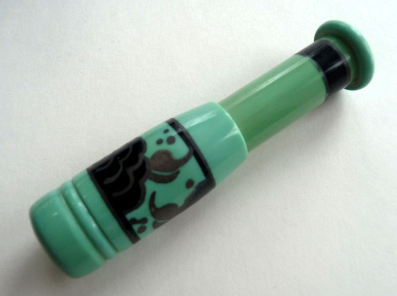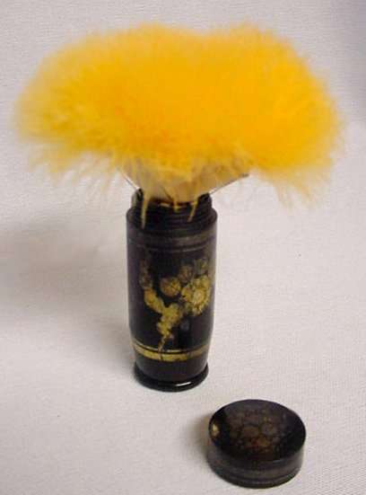 I just love these ingenious little Pli powder dusters made in France. What makes them unique is that the loose powder is put into the slender end (cap with Pli name on it unscrews). The opposite end also unscrews and as you push the tube inward, a feathered puff pops out the other end! With a little shake, the powder is then dispensed into the puff for dusting onto your face. This one is a rare black color with a gold floral design around the outside. It is in excellent condition (minor wear to the gold) and the feathers are all intact and fluffy like new. Just a wonderful little invention! Measures 3-1/4" long x 3/4" wide overall. (Click on pic for more photos.) |