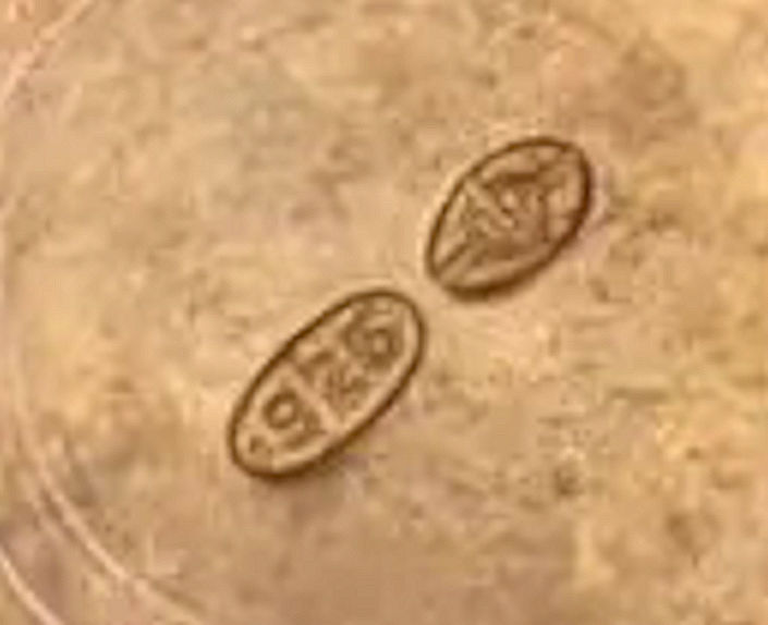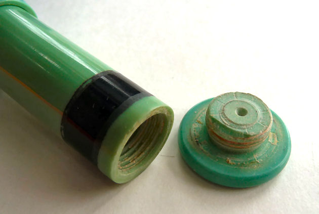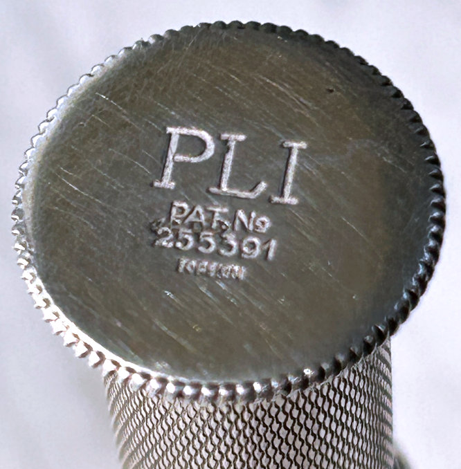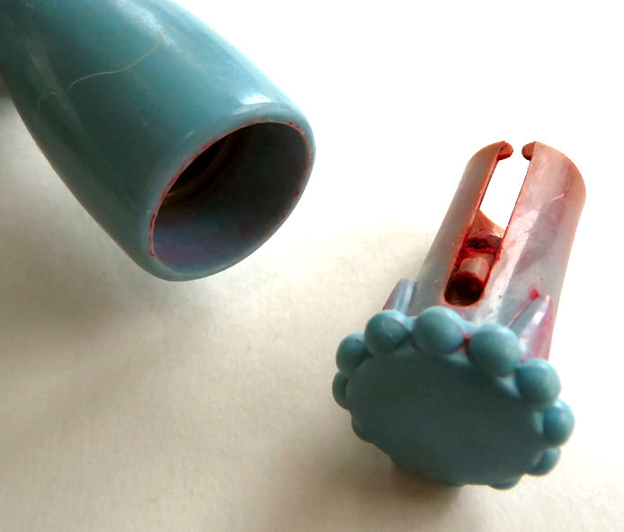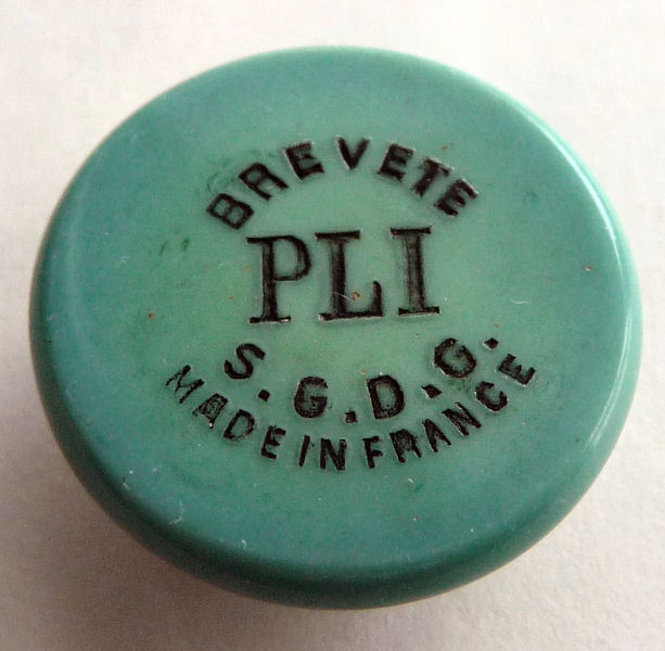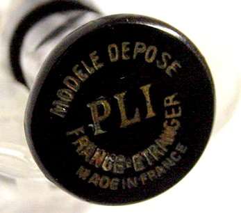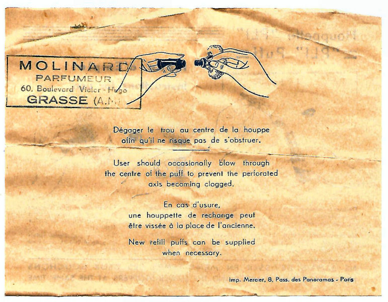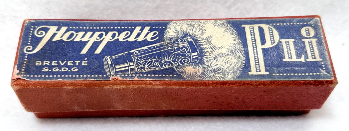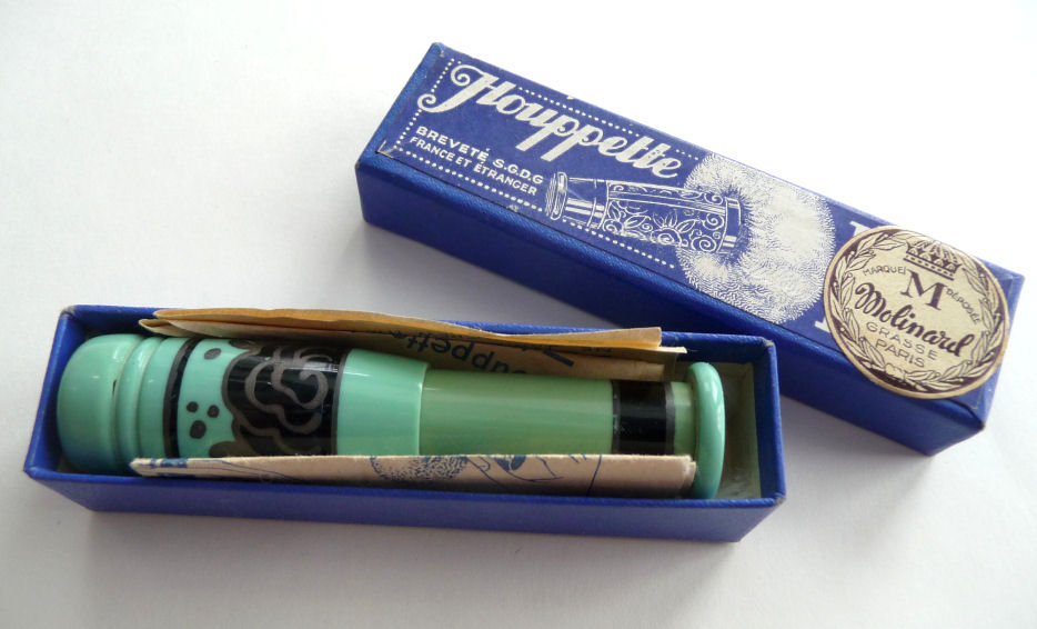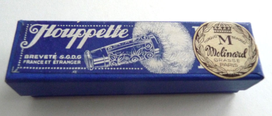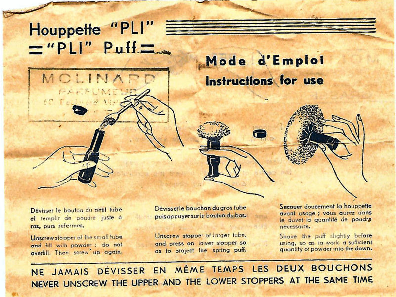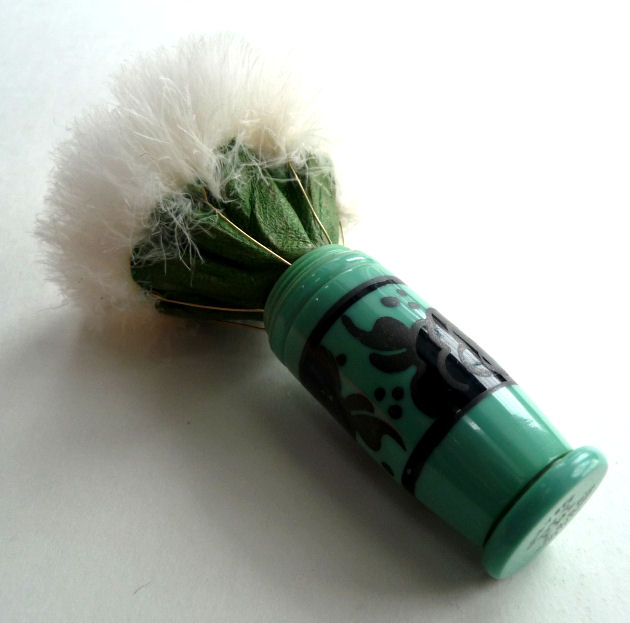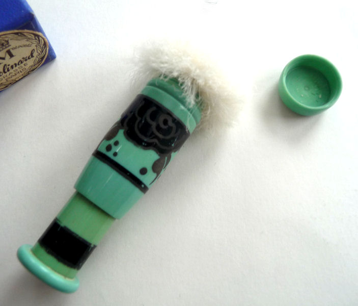 I just love these ingenious little Houppette Pli powder dusters made in France. What makes them unique is that the loose powder is put into the slender end (cap with Pli name on it unscrews). The opposite end also unscrews and as you push the tube inward, a feathered puff pops out the other end! With a little shake, the powder is then dispensed into the puff for dusting onto your face. This one is an aqua green/blue color with a black and silver-based overlay design on both ends ... quite pretty! There is just a wee bit of wear to the silver on the handle end. The puff is in excellent condition as are the supporting wires that hold it. The box has cotton padding inside and the original instructions are still there. The box is also in excellent condition with the original Molinard stamp on the outside. Only other thing I would like to point out is that the handle is a bit darker color than the top ... not sure if this was made this way or if it could perhaps be cleaned? I don't know but am leaving it as it is. Just a wonderful little invention! Measures 3-1/4" long x 3/4" wide overall. Box is 3-3/4" long x 1" wide x 7/8" high. (Click on pic for more photos.) |