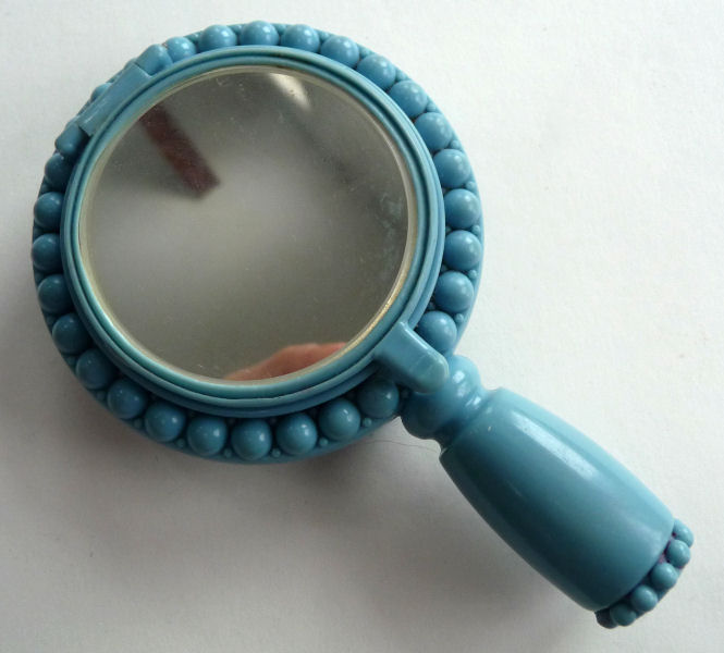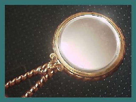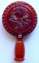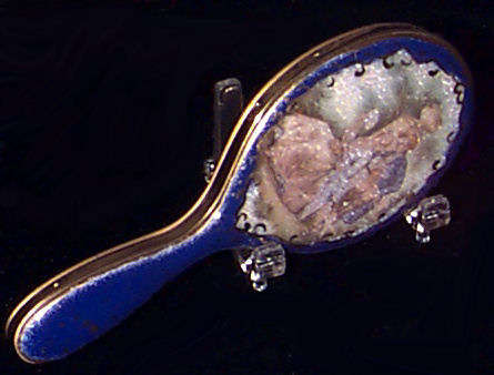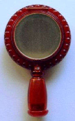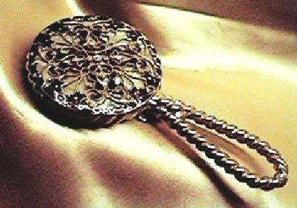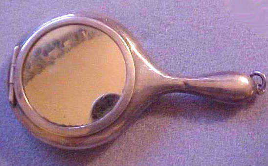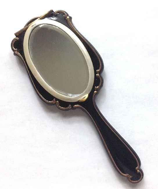 Here we have a wonderful little compact in the shape of a hand mirror ... it was made in France. The filigree is deep and beneath it can be seen a pearlized celluloid backing ... very pretty! The compact itself has a beveled mirror on the reverse side which opens to reveal another beveled mirror on the inside. Appears to have never been used.. Made in France. Measures 4-3/4" long x 2-1/4" diameter. Excellent condition! (Click on pic for more photos.) |
