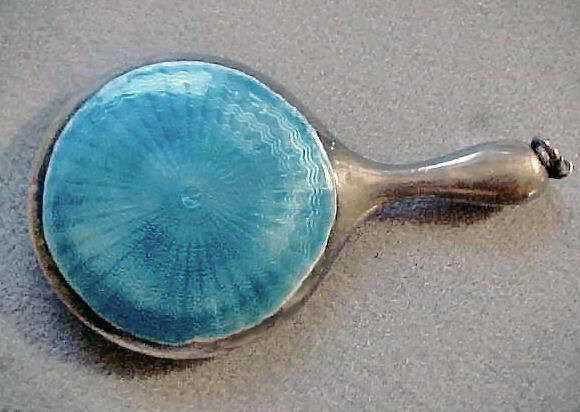 This is a darling little chatelaine compact in sterling silver with an aqua enamel guilloche top. The reverse side has a mirror on the front and also opens to reveal a powder well with another mirror inside in excellent condition. Tiny ring at base of handle is to attach to a chatelaine but could be worn on a pendant as well. The enameling is in excellent condition with a tiny bit of roughness around the perimeter which is partially the way it was made and partially from wear. Trust me when I say the lighting in the photo makes it look much worse than it is ... in person it appears to be fine. Measures 3-1/2" long x 1-3/4" wide overall. (Click on pic for more photos.) |