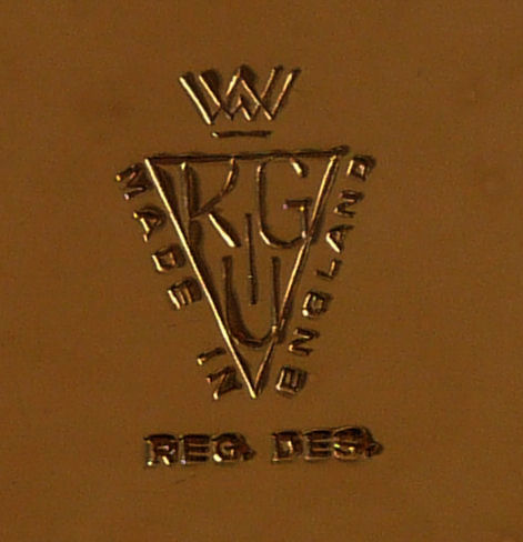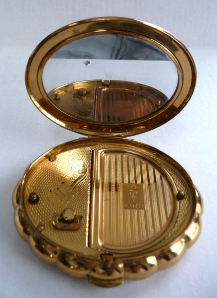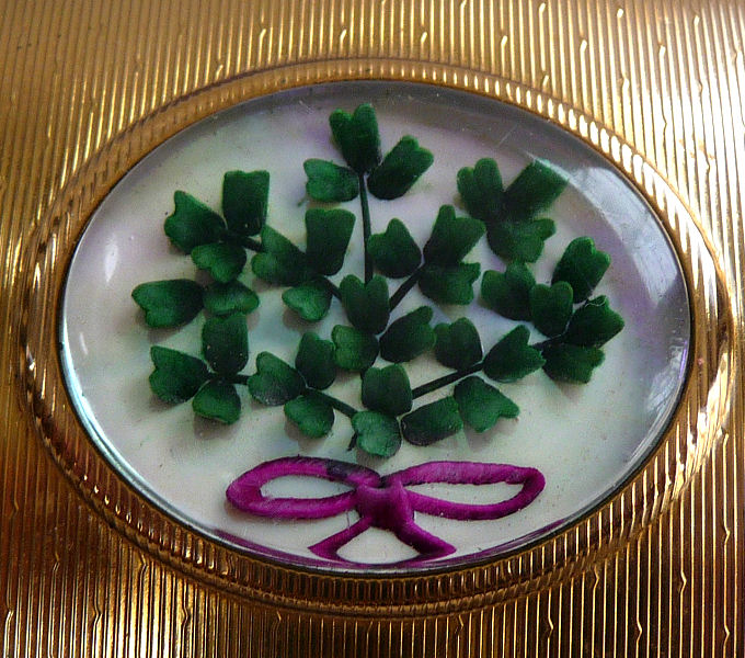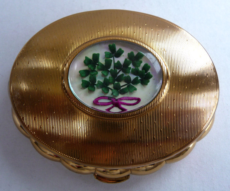 This is a rare design Kigu compact with a "window" in the top showcasing a delightful shamrock bouquet ... perfect for St. Patrick's Day! The case is a bright and shiny gold with embossed design on the top and a scalloped shell effect around the sides. Inside is a mirror in the lid, a covered powder well with original unused screen on the right, and a "Minuette" music box on the left (click here for a video to hear the music). The piece is in very fine condition with only the most minor scuffs on the bottom edge ... it has been stored in a black silk pouch which will be included. Just about as close to mint condition as possible for an item of this age which has never been used. Measures almost 3-1/2" x 3" x 1" thick. (Click on pic for more photos.) |