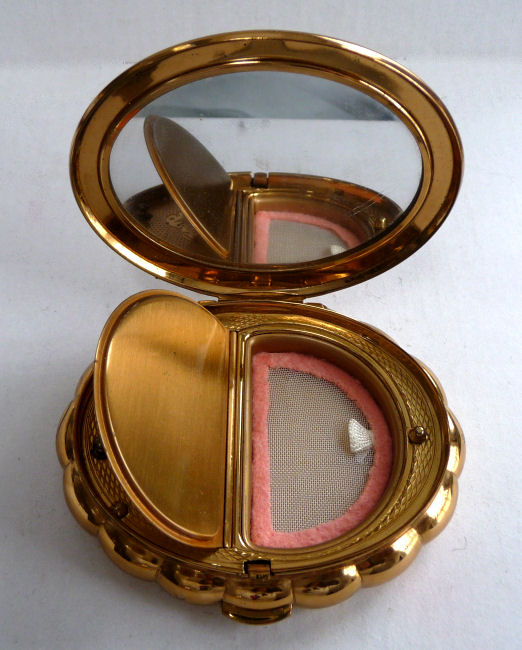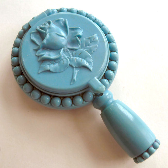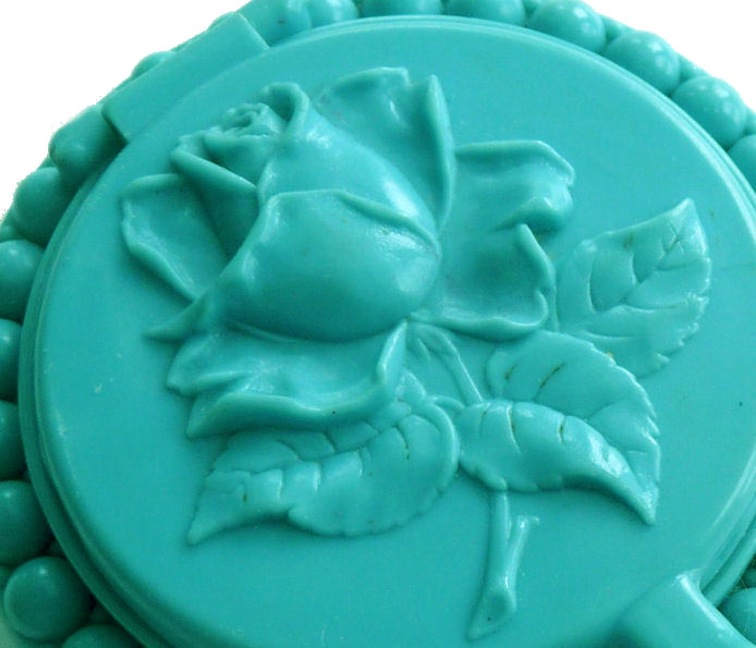 Another one of my favorite compacts due to the ingenious design and use of space. The front has a beautiful deeply embossed rose surrounded with leaves ... the outer rim has raised beaded design. The rose lifts up to reveal a mirror inside the lid and the original powder screen in base. Flip it over and there is a mirror on the back side as well. This also opens up to reveal yet another mirror on the reverse side and a rouge pot in the base with original Plate' puff. Rouge still inside! The handle pulls out to offer a storage compartment for a tiny lipstick. There were different versions of this design made ... I have seen them both with the open handle like this and with the lipstick attached. Excellent condition throughout. Measures 4-1/2" long x 2-3/4" wide overall. (Click on pic for more photos.) |
