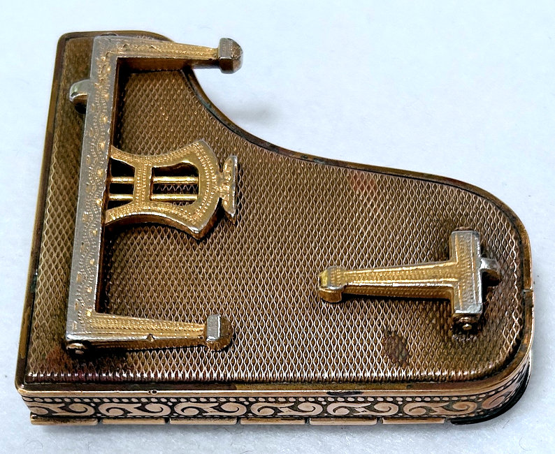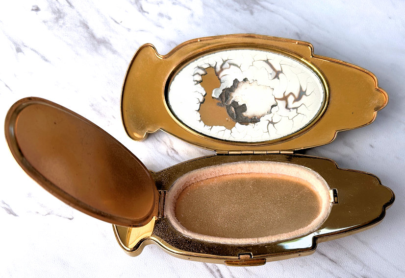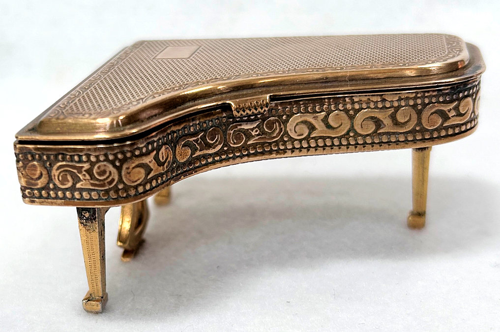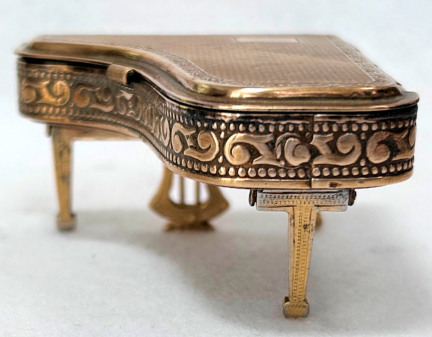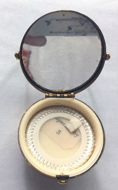 This is a fairly difficult compact to find and has been in my collection since 2017. Made in England by Pygmalion, it is a Sonata Grand Piano shape. Even though it is not in mint condition, I bought it anyway because I wanted one of these in my collection and it has displayed in a place of honor in my curio. Now I am ready to part with it :-) The legs fold down so it can lie flat. The lid opens to reveal a mirror in the lid with silver loss around the edges but most of it is clear and usable (as you will see reflections in the photos). The lid for the powder well is missing the clasp that holds it closed so you would technically not be able to use this with loose powder as it would come out. That being said, it is still a great piece for display and is priced accordingly (in fact, I am pricing it at what I paid for it years ago). Overall when legs are folded flat, it measures 2-3/4" x 2-3/8" x 3/4" high. With legs open, it is 1-3/8" high. (Click on pic for more photos.) |