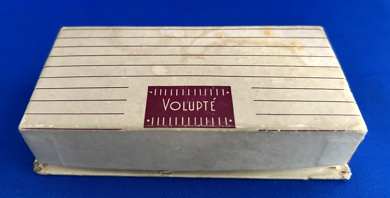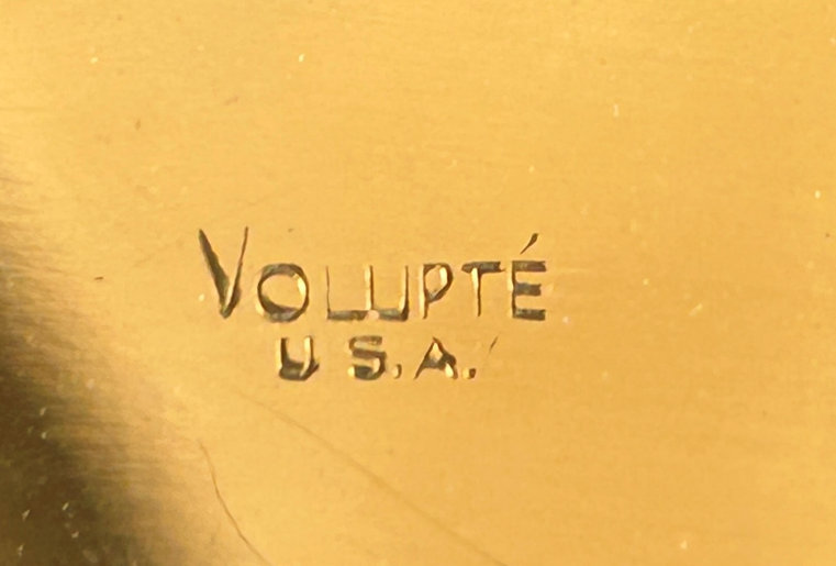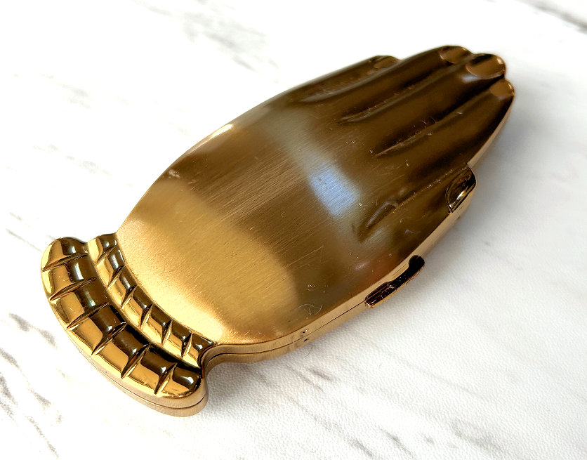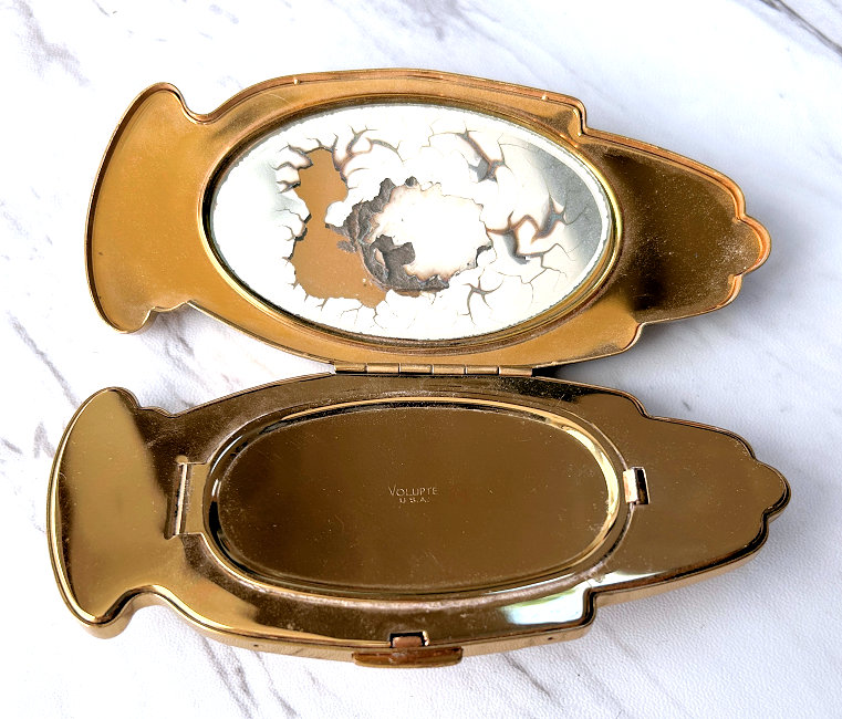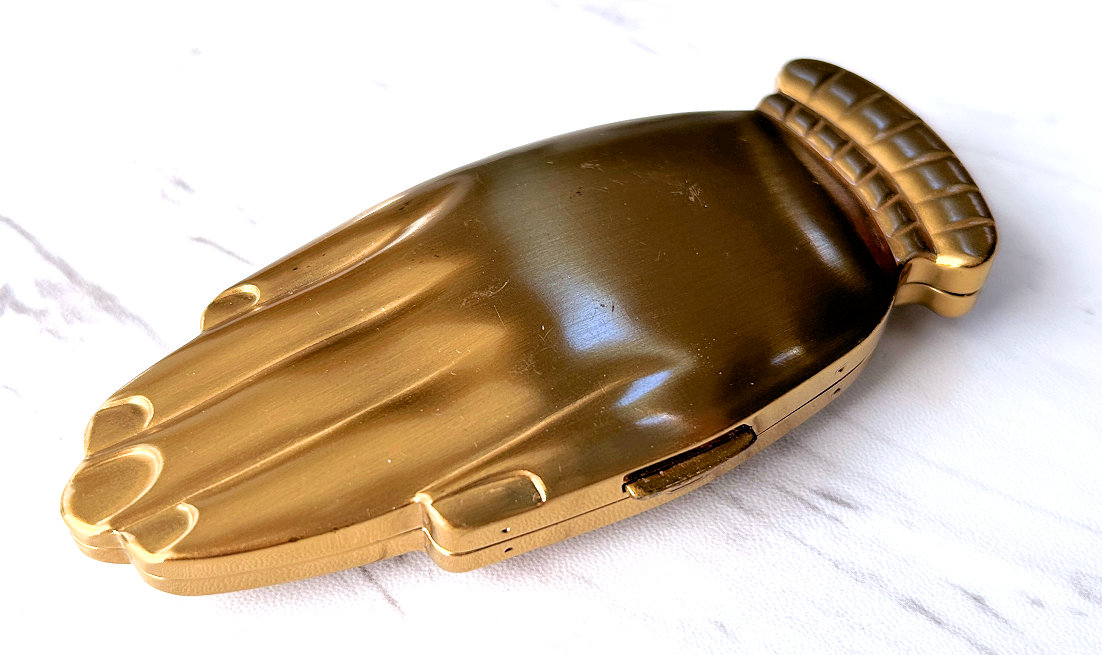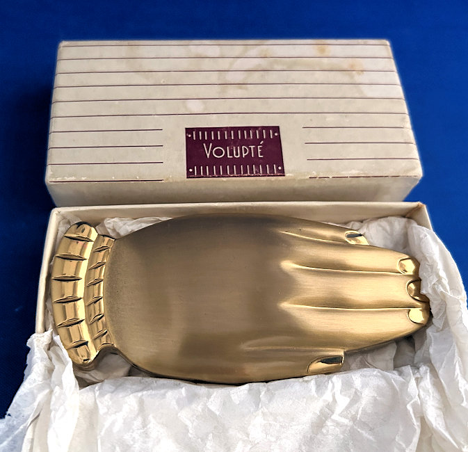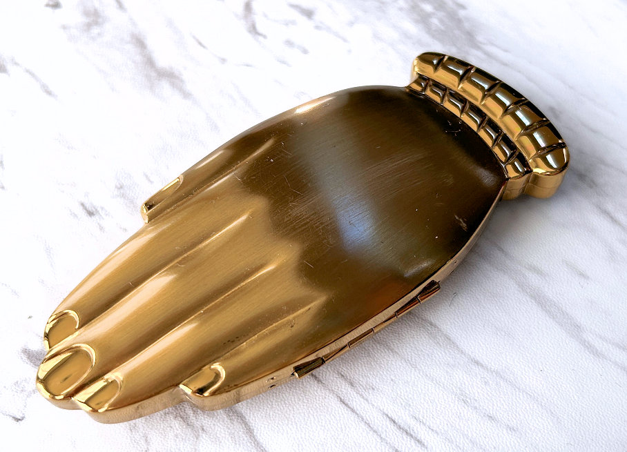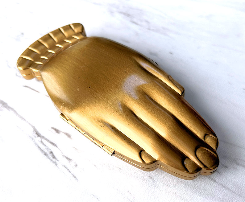 Volupte' made an entire line of these hand compacts in various styles and trims. This one was from the Golden Gesture collection and is all gold on front and back. The hand opens to reveal a mirror in the top portion (does show wear and some silver loss). The compact is in overall excellent condition with no dents or discernible damage and even comes in its original Volupte' box. If you really scrutinize, there may be one or two very faint marks on the top but only seen upon very close inspection. I have taken several photos from different angles for your perusal. It's about as perfect on the outside as you will ever see! The compact is marked Volupte' USA on the powder cover inside and has a patent number in the powder well. Measures 4-5/8" x 2" overall. (Click on pic for more photos.) |