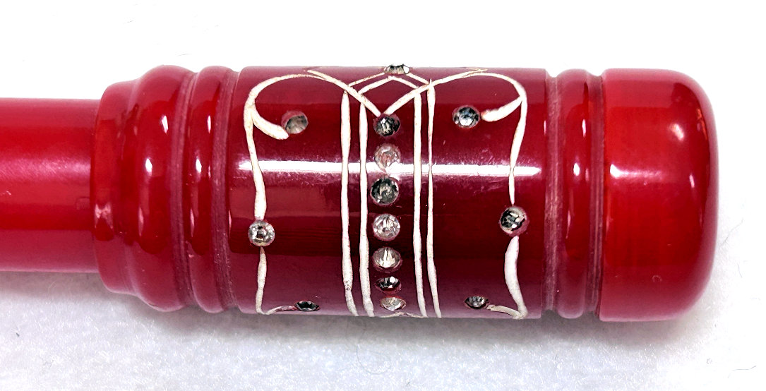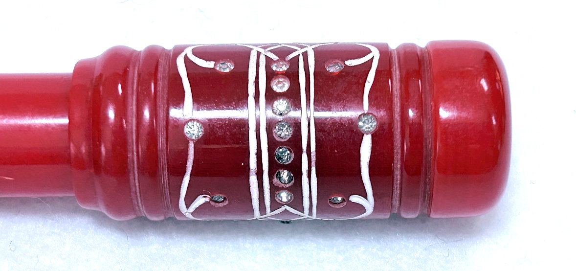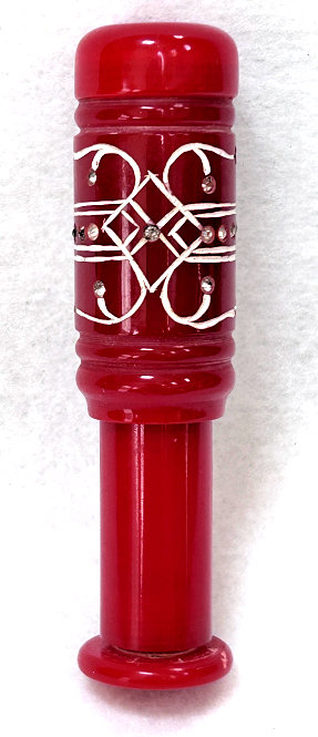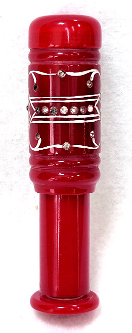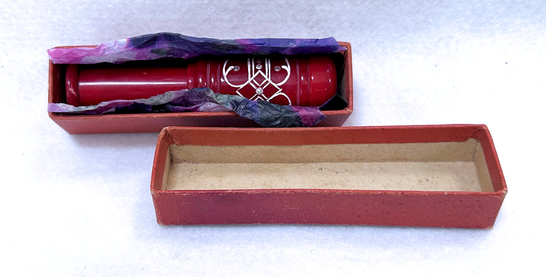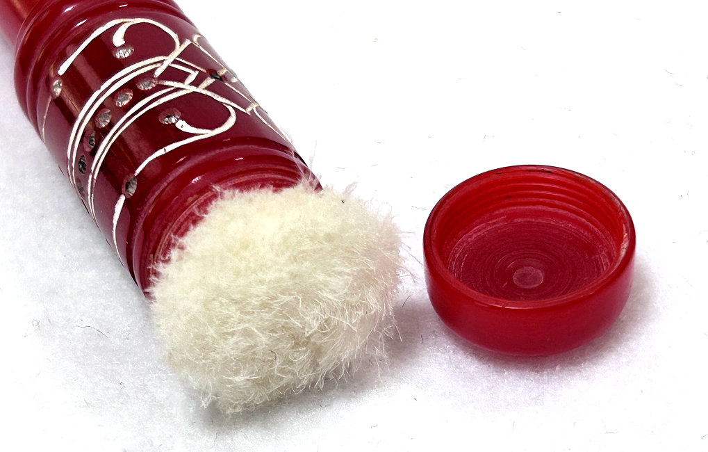 I just love these ingenious little Houppette Pli powder dusters made in France. What makes them unique is that the loose powder is put into the slender end (cap unscrews). The opposite end also unscrews and as you push the tube inward, a feathered puff pops out the other end! With a little shake, the powder is then dispensed into the puff for dusting onto your face. This one is a bright cherry red with white designs embedded with dozens of little rhinestone jewels ... so pretty!!! The puff is in excellent condition as are the supporting wires that hold it. The box is also in excellent condition with the original "Houpette Pli" logo on the lid. Overall this one is pretty much in mint condition. Just a wonderful little invention! Measures 3-1/8 long x 3/4" wide overall. Box is 3-3/4" long x 1" wide x 7/8" high. (Click on pic for more photos.) |
