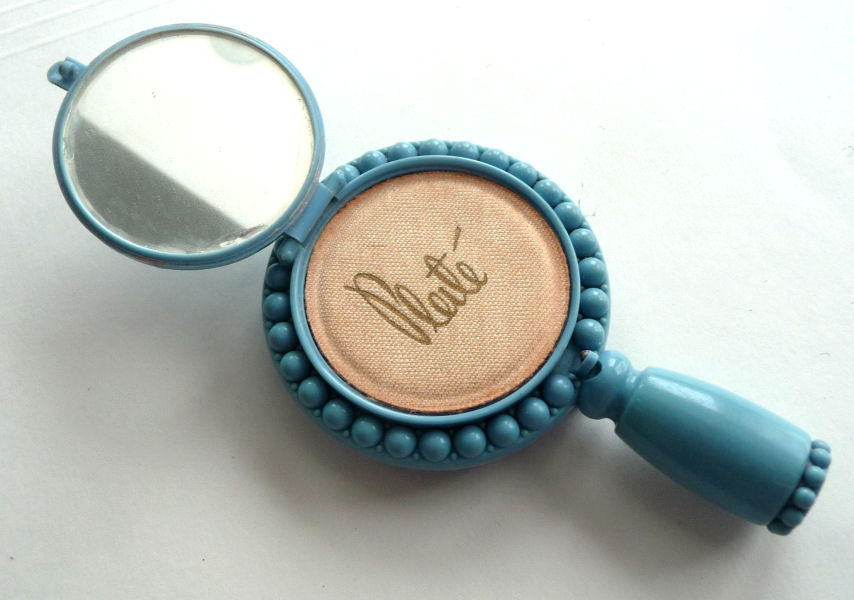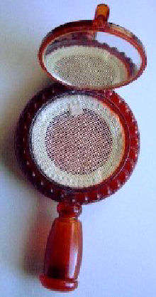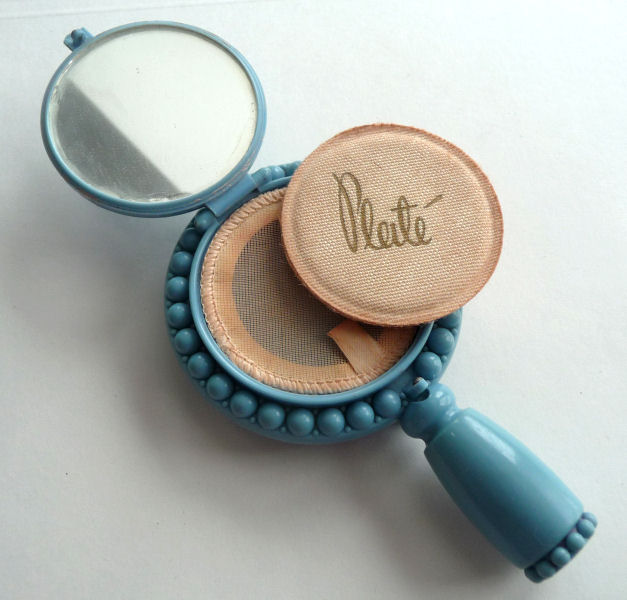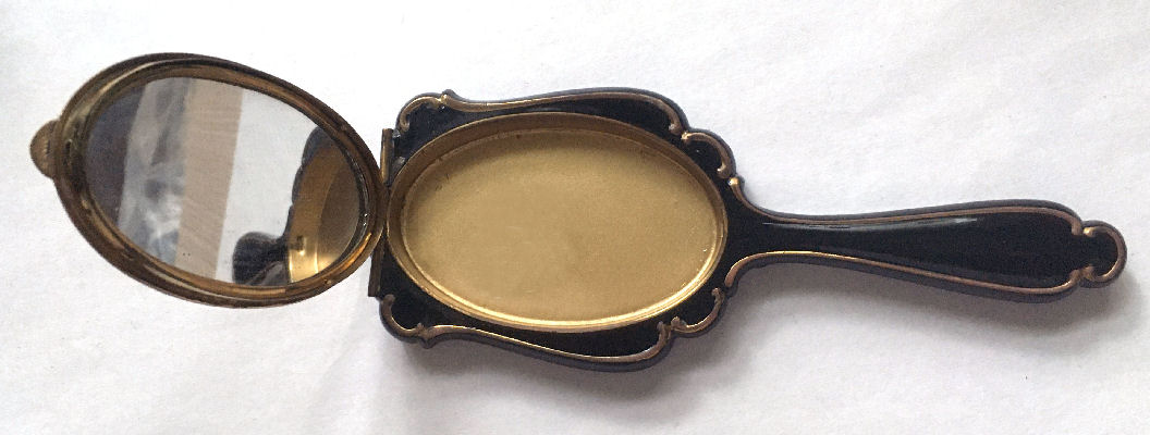 Here we have a wonderful little compact in the shape of a hand mirror... it comes with its own little protective sleeve which is stamped "sanz tarongi-paris" on the inside. The compact itself has a beveled mirror on the reverse side which opens to reveal another beveled mirror on the inside. Original powder screen can be found inside with traces of loose powder and a pretty peach-colored swansdown puff. Made in France. Measures 4-3/4" long x 2-1/4" diameter. Excellent condition! (Click on pic for more photos.) |