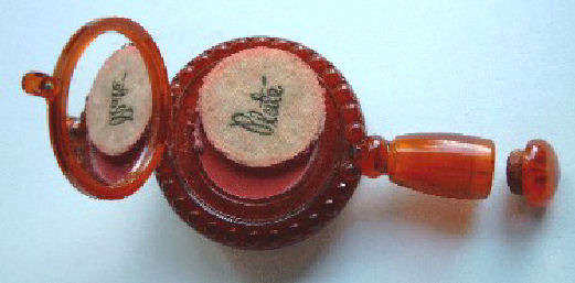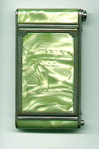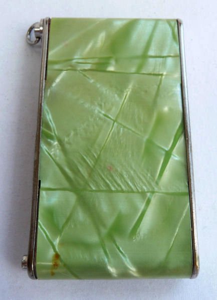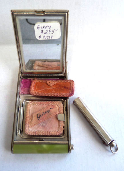 Here we have a fun little vanity known as a "camera" case due to its unique design which resembles a camera. Celery green marbleized celluloid covers both front and back of this delightful vanity made by Girey. The little button on the lower right corner pops up the center panel which reveals a beveled mirror in the lid (fairly cloudy due to age). In the bottom is a rouge pot with original puff and rouge still intact (slightly used) and a covered powder well, also with original puff. The other end of the compact has a little ring that when pulled upon, a lipstick slides out. This can also be used to clip the vanity to a purse or key chain. Very clever! Celluloid is all in reasonably good condition with one little dark spot on the back lower edge (see pics). Measures 1-3/4" wide x 3-1/4" high. (Click on pic for more photos.) |