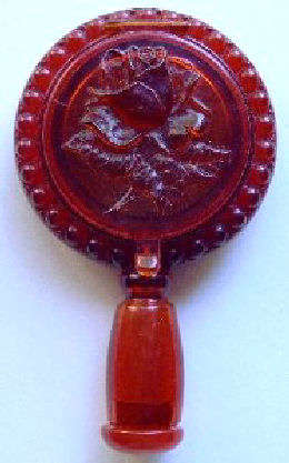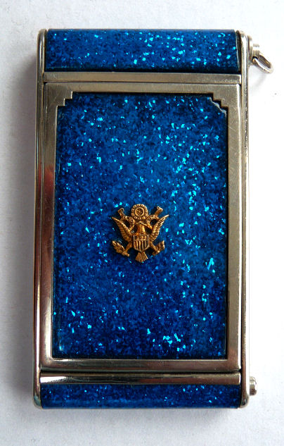 Here we have a fun little vanity known as a "camera" case due to its unique design which resembles a camera made by Girey. Try as I might, I could NOT get the blue color to show up accurately. Although it looks like a royal blue, in reality it is a vibrant bright deep turquoise with what look to be mica flakes throughout the celluloid that sparkle beautifully. In the center is a brass 3-dimensional eagle with shield and arrows (see close-up).The little button on the lower right corner pops up the center panel which reveals a beveled mirror in the lid (with only a few spots of foxing). In the base is a covered powder well with original unused puff and a rouge pot with a slightly used puff and original rouge still intact. The other end of the compact has a little ring that when pulled upon, a lipstick slides out. This can also be used to clip the vanity to a purse or key chain. Very clever! It is in excellent condition throughout. Measures 1-3/4" wide x 3-1/4" high. (Click on pic for more photos.) |