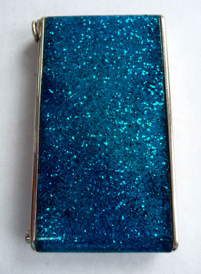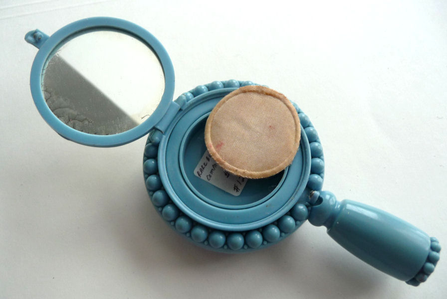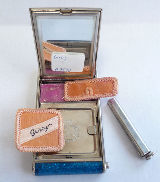 I've had this very pretty Girey camera compact in my collection for many years. The colors in this one are just extraordinary ... turquoise blue case with mica flakes make it sparkle like jewels. The cover depicts the Sky Ride and says Sky Ride, Century of Progress, Chicago, 1934. The interior opens to reveal a nice beveled mirror in the top, rouge pot (rouge still intact) and covered powder pot. Both of the original puffs are still there. Now for the condition: there is normal age appropriate wear to the silver frame as evidenced in the pics. There is a split in the frame (also visible in close-up) right at the hinge point. I have had this repaired so that it works perfectly but the split is still visible. It didn't bother me as the compact is just so unique and pretty that it's not really noticeable. Other than that, the compact is in great shape. It measures 1-3/4" wide x 3-1/4" long. (Click on pic for more photos.) |