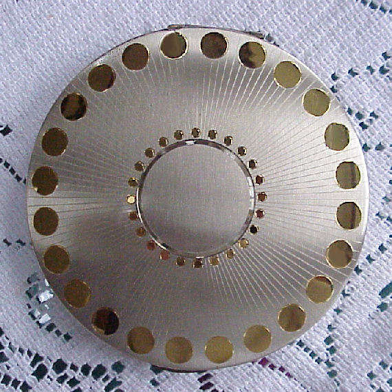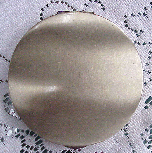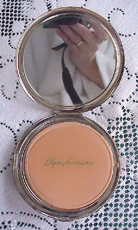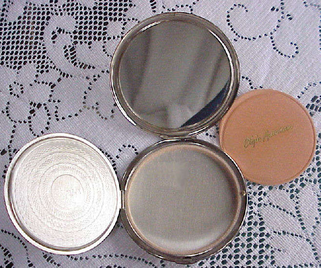 This is a large mint condition Elgin compact in the shape of a spaceship and all in sterling silver! This is a design I have never seen before ... interior has a large mirror in the lid and a covered powder well in the bottom with spring latch. Original unused puff still inside marked "Elgin American". One of the finest compacts I've run across ... and condition is extraordinary ... no dents or scratches to surface at all. Measures 4" diameter! (Click on pic for more photos.) |
