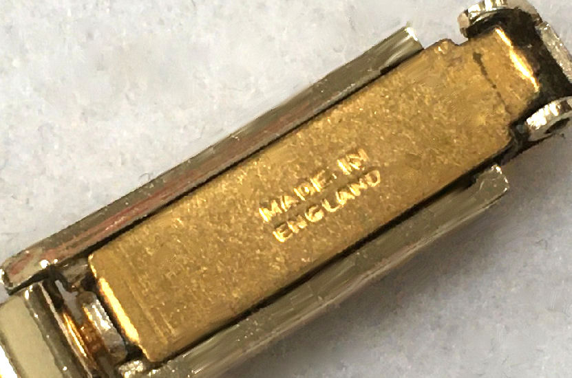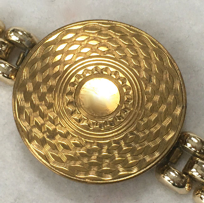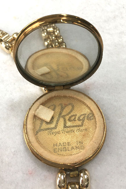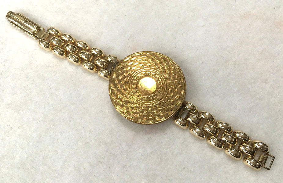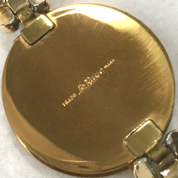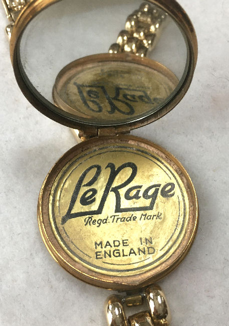 Another rare item is this bracelet compact made in England by LeRage. The piece is all original and has a lovely gold tone compact with very detailed bracelet. The compact opens to reveal a mirror in the top and a powder screen in the base with the LeRage logo beneath. It is really a stunning piece and is in excellent condition! The compact measures 1-5/8" diameter and the overall length is 6-3/4" long. (Click on pic for more photos.) |