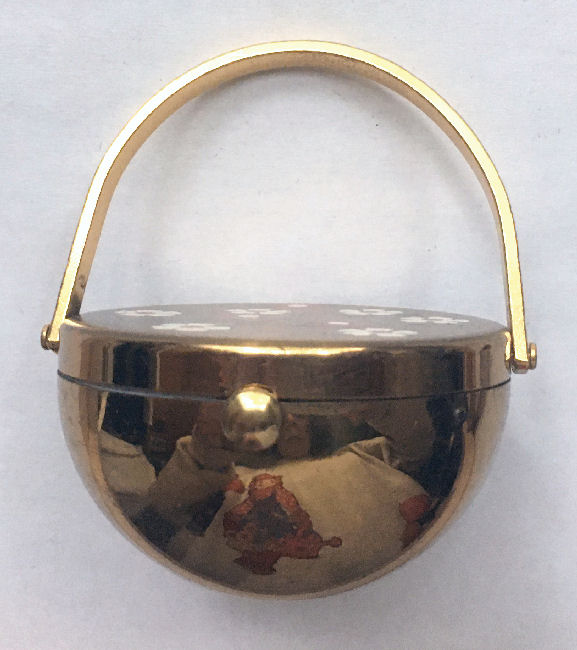 Here is a darling little compact made to look like a basket of flowers ... how sweet is that? Made by Parker Pen Wadsworth, it features a swivel embossed handle over a basket-shaped gold base with enamel red and white flowers sprinkled on the cover. The handle folds down so as to take up less space in your purse. Inside the compact has a mirror in the lid and a brand new unused powder screen in the base along with an "Inspected by 5" paper slip. The original puff is no longer there but it is obvious the compact was never used. It is in excellent condition with the only apology being a little rub mark on the back lower half from storage and where the handle rubs the sides when lowered. Measures 2" diameter (basket) x 1-1/4" high not counting handle.. (Click on pic for more photos.) |