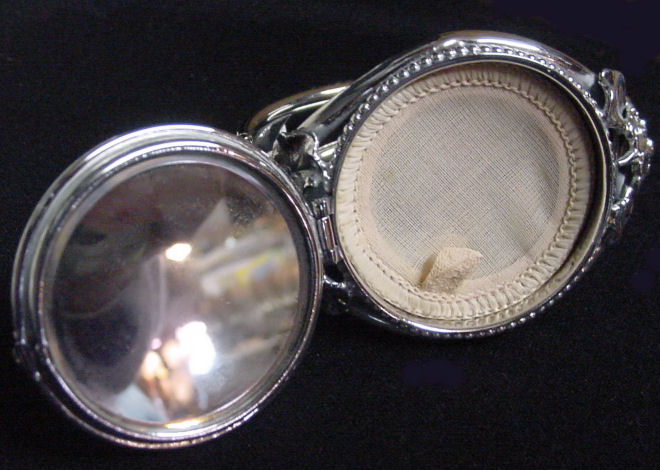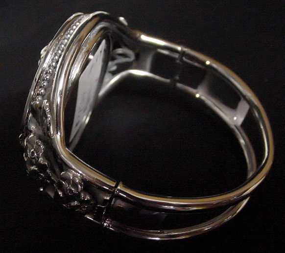 This is a very pretty and feminine bracelet with a compact inside. There are 3-dimensional flowers on the top and sides of this piece. The bracelet opens with a clasp and is hinged on the opposite side. The top lifts up to reveal a mirror in the lid and original powder screen in the base. Measures 2-1/2" diameter. Top (compact) measures 1-7/8 ". Excellent condition throughout ... doesn't appear to have ever been used! I will include a tiny swansdown puff (not pictured). Unmarked. (Click on pic for more photos.) |
