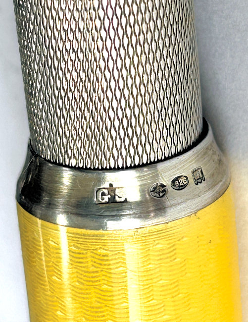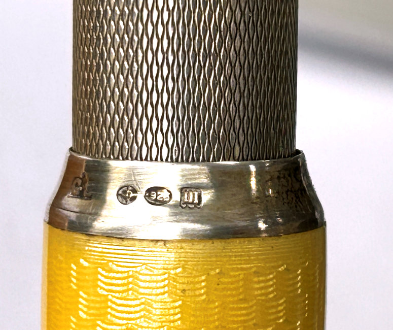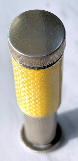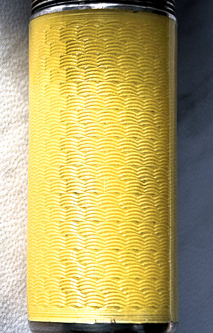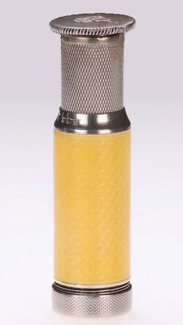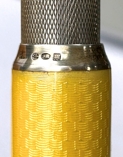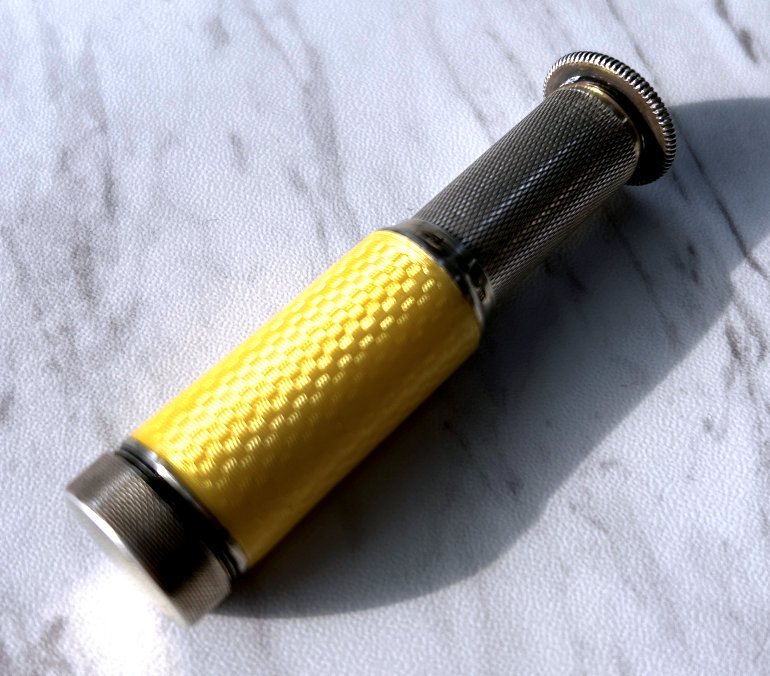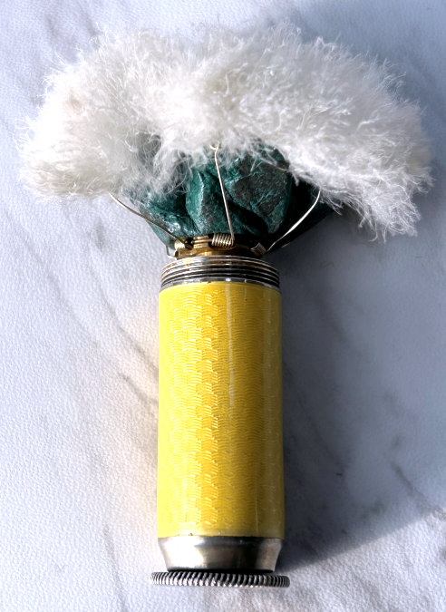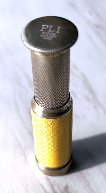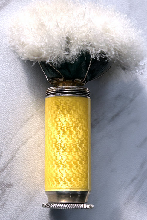 I just love these ingenious little Pli powder dusters with built-in powder containers and puffs.. What makes them unique is that the loose powder is put into the slender end (cap with Pli name on it unscrews). The cap at the top unscrews and as you push the tube upward, a feathered puff pops out the top! With a little shake, the powder is then dispensed into the puff for dusting onto your face. This one is an extremely rare sterling silver yellow enamel guilloche. It is only the second enamel guilloche sterling silver Pli I have ever seen in all my years of collecting and the ONLY one I have ever seen without damage to the enamel. This one is in absolutely mint condition with no damage to the enamel whatsoever. It is hallmarked 925 for sterling and for George Stockwell of London with date mark 1927. It is an absolutely stunning little piece and totally functional. Just a wonderful little invention! Measures just a tad over 3" long x 3/4" diameter. There are 20 photos from all angles of this piece so be sure to view them all. (Click on pic for more photos.) |