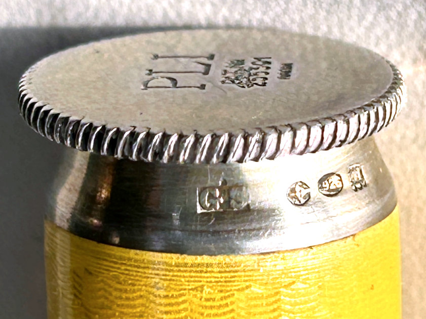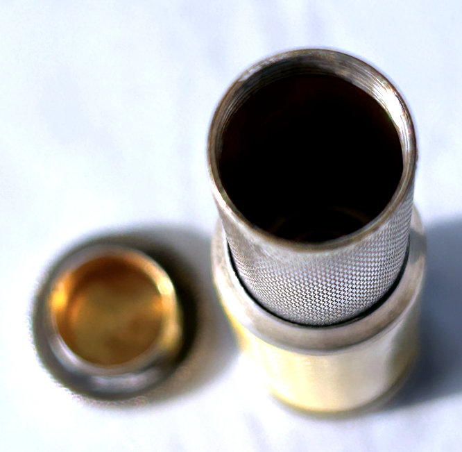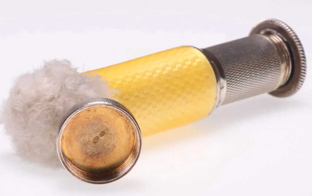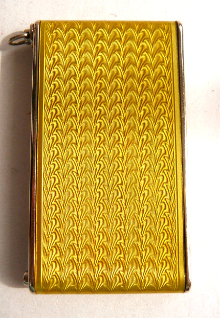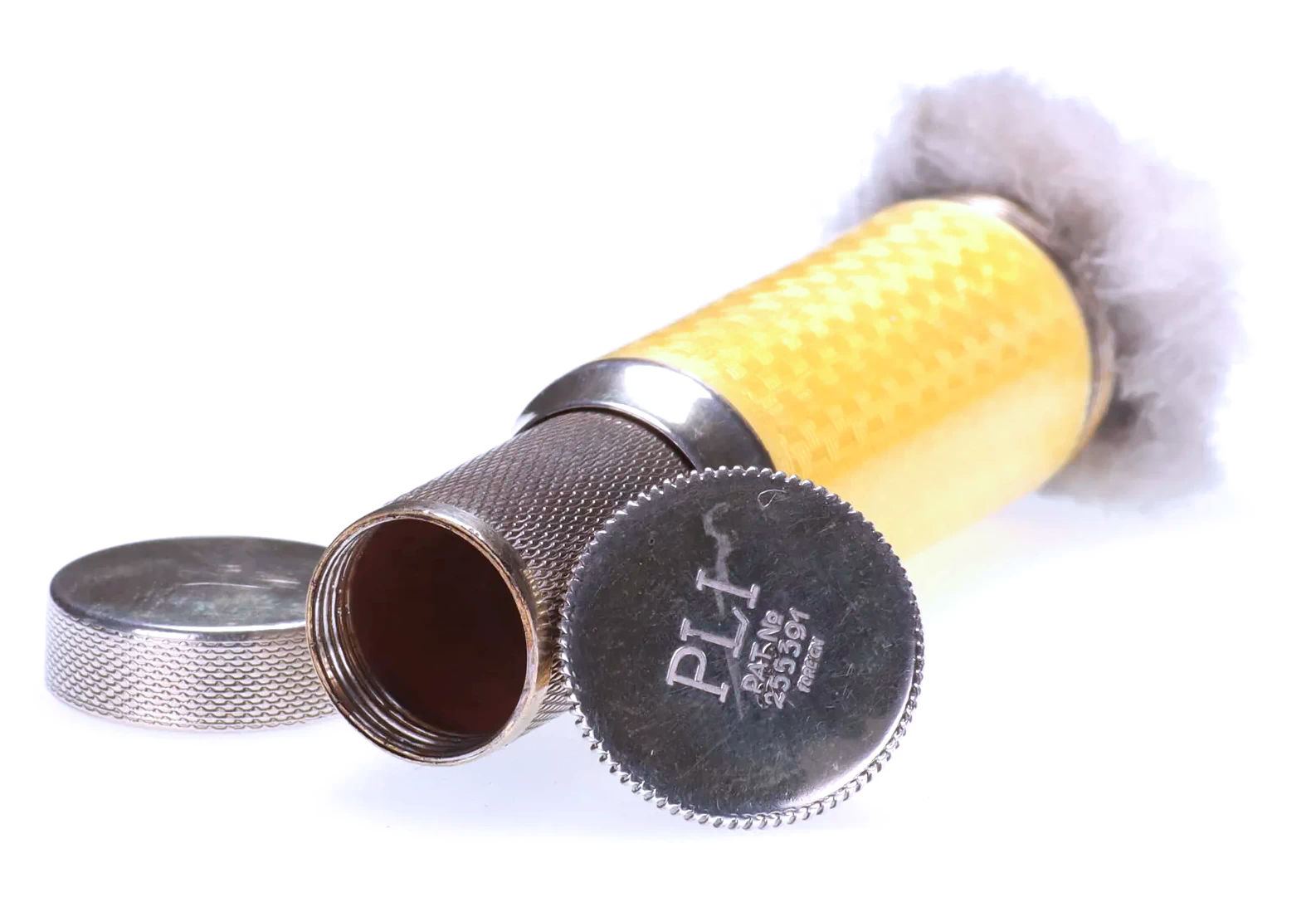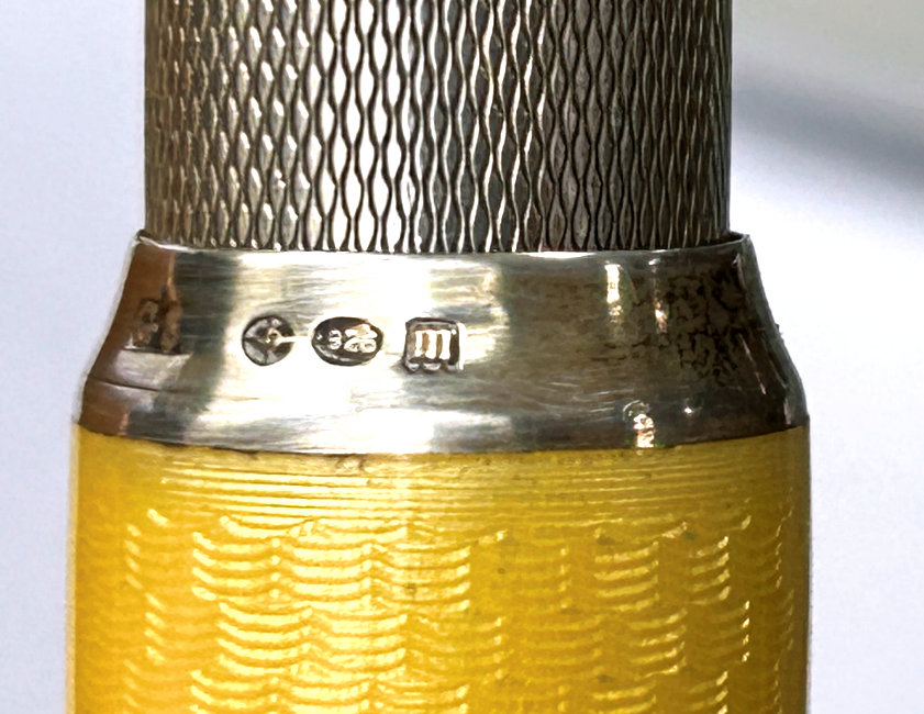 I just love these ingenious little Pli powder dusters with built-in powder containers and puffs.. What makes them unique is that the loose powder is put into the slender end (cap with Pli name on it unscrews). The cap at the top unscrews and as you push the tube upward, a feathered puff pops out the top! With a little shake, the powder is then dispensed into the puff for dusting onto your face. This one is an extremely rare sterling silver yellow enamel guilloche. It is only the second enamel guilloche sterling silver Pli I have ever seen in all my years of collecting and the ONLY one I have ever seen without damage to the enamel. This one is in absolutely mint condition with no damage to the enamel whatsoever. It is hallmarked 925 for sterling and for George Stockwell of London with date mark 1927. It is an absolutely stunning little piece and totally functional. Just a wonderful little invention! Measures just a tad over 3" long x 3/4" diameter. There are 20 photos from all angles of this piece so be sure to view them all. (Click on pic for more photos.) |