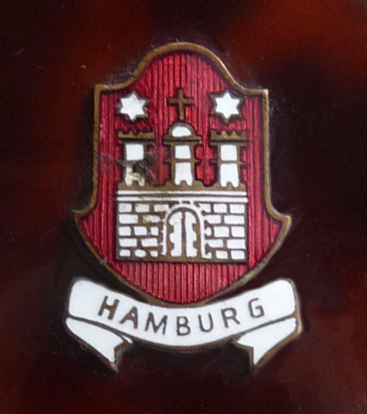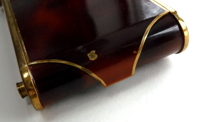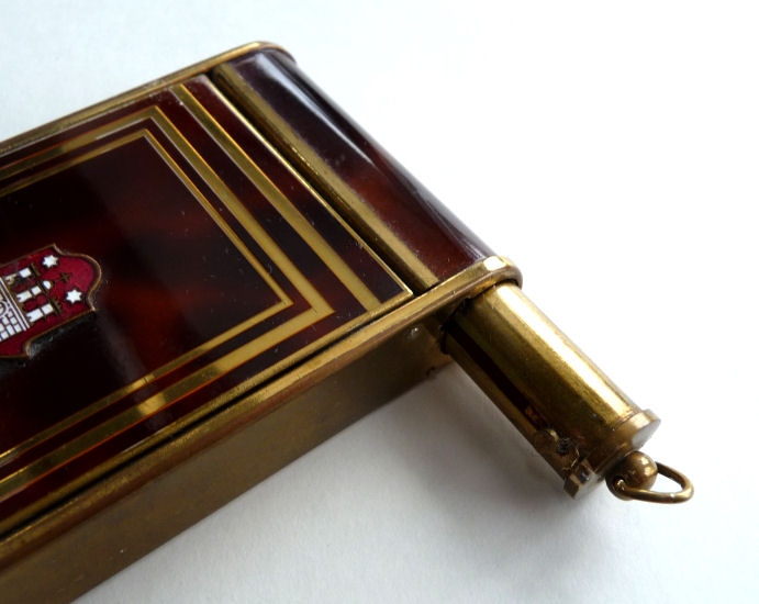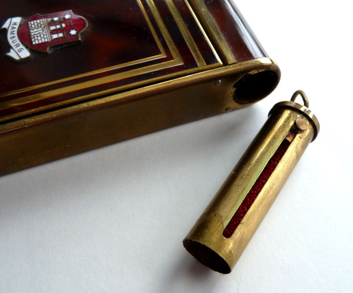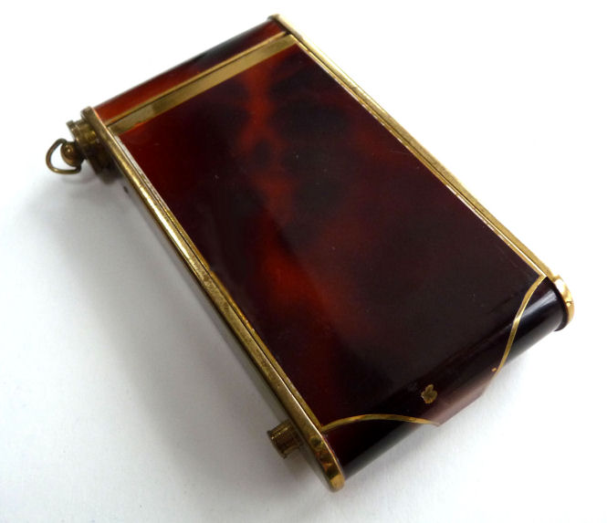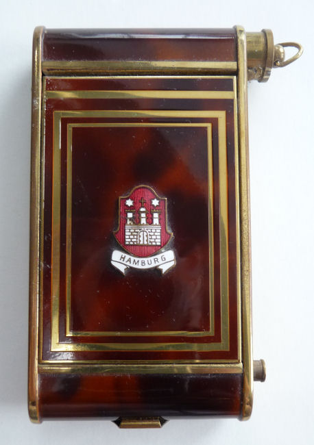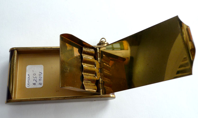 Here we have a fun little vanity known as a "camera" case due to its unique design which resembles a camera. This one is done in faux tortie finish and was made in Germany ... there is a cartouche on the front depicting the Ahrensburg Caslte in Hamburg, Germany, probably made for the tourist trade in the 40's or 50's. The little button on the lower right corner pops up the center panel which reveals a mirror in the lid and an original powder screen in the base with traces of loose powder beneath. If you turn the compact over, there is a clip that opens to reveal a large compartment for paper money and a spring-loaded cigarette holder. The other end of the compact has a little ring that when pulled upon, a lipstick slides out. This ring can also be used to clip the vanity to a purse or key chain. Very clever! It is in excellent condition with the exception of two specks of enamel loss on the back on the clasp portion (see photos). Measures 2" wide x 3-7/8" high. (Click on pic for more photos.) |