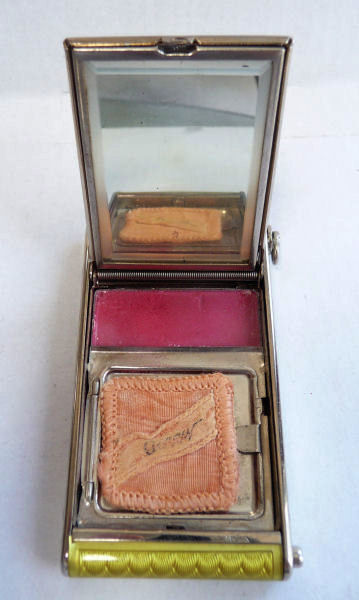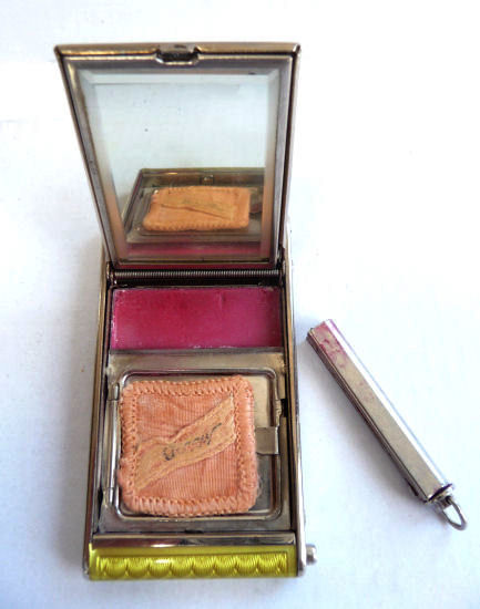 Another one of my favorite compacts due to the ingenious design and use of space. The front has a beautiful deeply embossed rose surrounded with leaves ... the outer rim has raised beaded design. The rose lifts up to reveal a mirror inside the lid and the original powder screen and original Plate' puff in base. Flip it over and there is a mirror on the back side as well. This also opens up to reveal yet another mirror on the reverse side and a rouge pot in the base with puff. The handle pulls out with a lipstick attached. Excellent condition throughout with the exception of a bit of crinkling on the silver of the rouge mirror inside. Measures 4-1/4" long x 2-5/8" wide overall. NOTE: Color is slightly different than picture shows ... please see the close-up photo for the truest color depiction. (Click on pic for more photos.) |