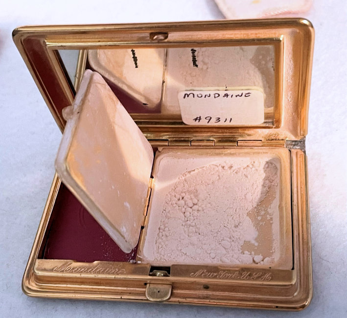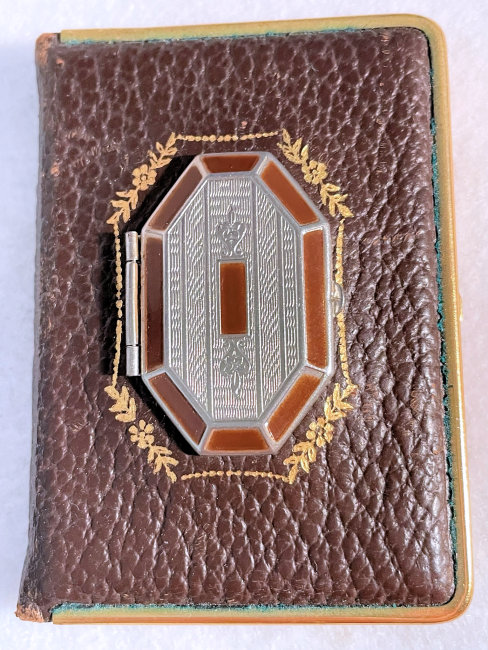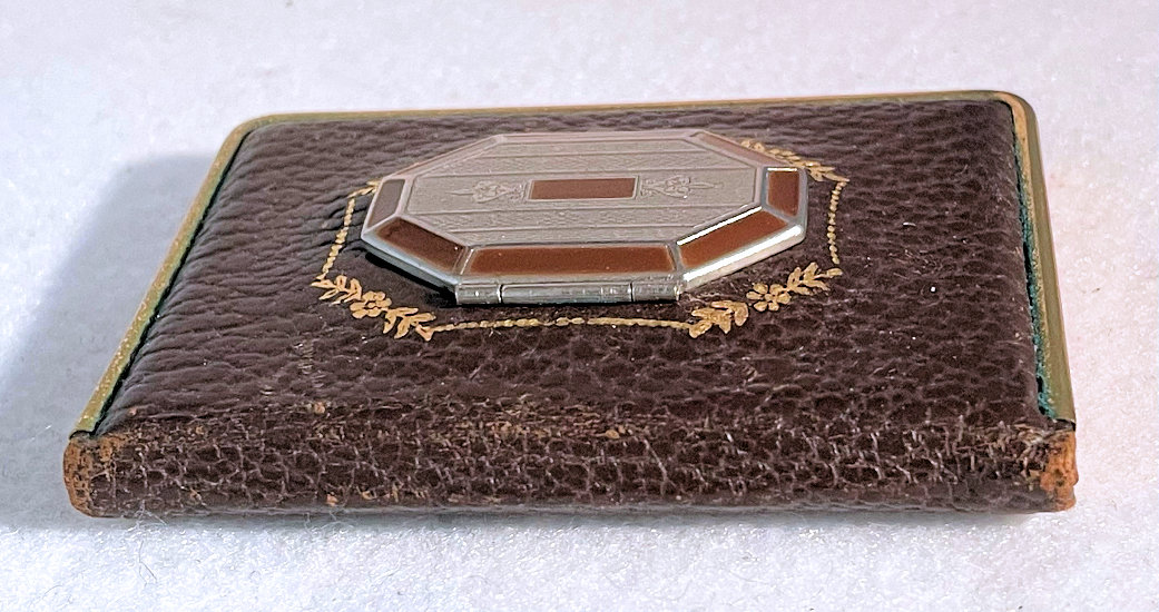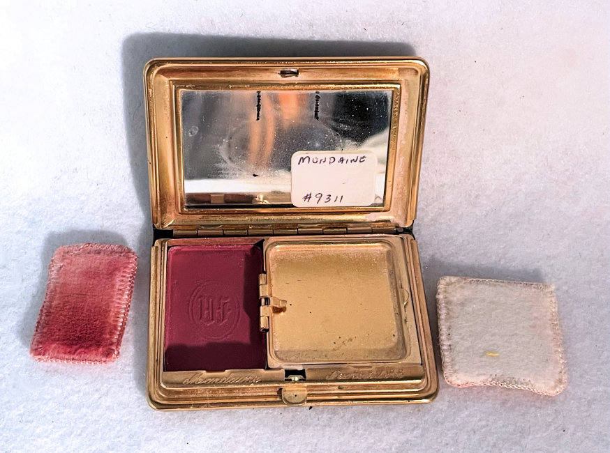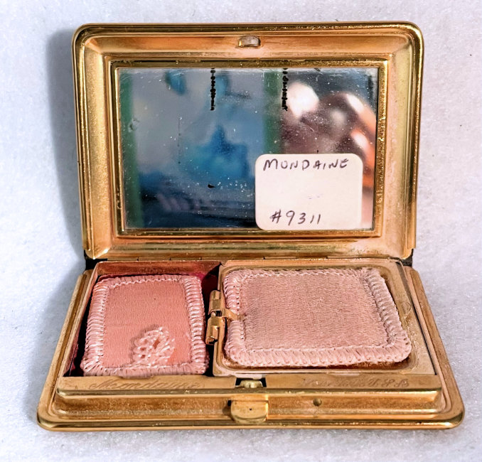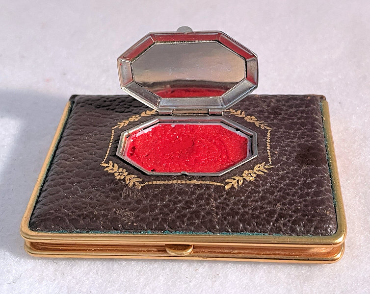 This has been one of my favorite little novelty compacts for many, many years in my collection. Made by Mondaine, this one has never been used and would be in mint condition if it weren't for some of the silver loss on the mirror due to age. Both of the original puffs are still inside, also unused. There is loose powder in the powder well and a rouge pot with the "M" for Mondaine still embossed in it. The front of the "book" features a secret compartment that opens to reveal lip gloss. The compact is covered front and back with faux leather and gold gilt and the lip gloss compartment has deep burgundy enamel trim. The frame on it is a bright gold and is in great condition. This is such a unique little case and a joy to own. Measures 2-3/4" x 2" overall. (Click on pic for more photos.) |