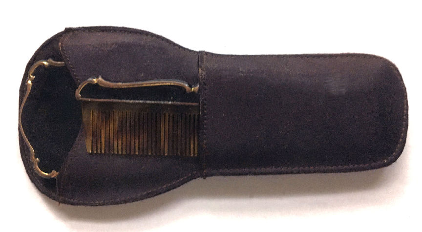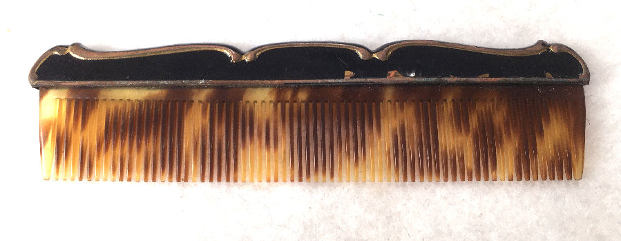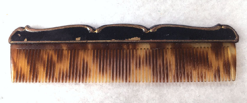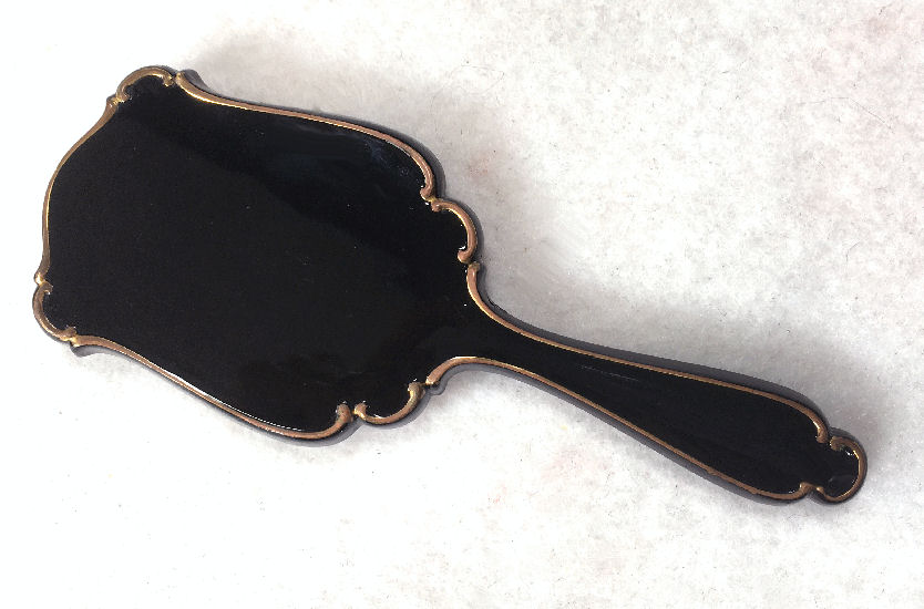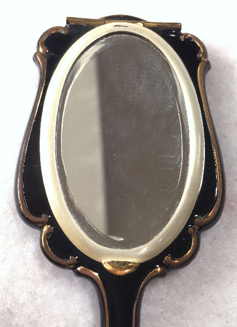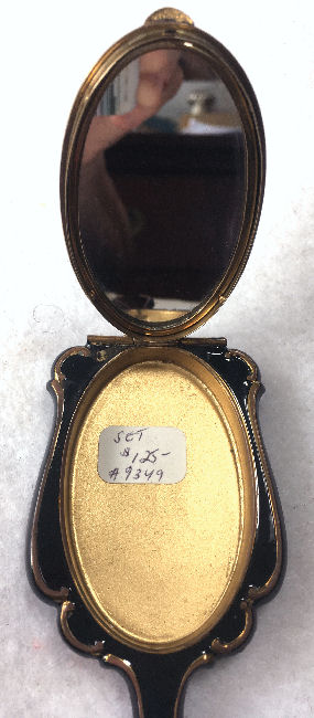 Although I cannot find a maker's mark on this set, it is very desirable and a great collectible just the same. Made in the shape of a fancy hand mirror, this little compact features an oval beveled mirror on one side that lifts to show another mirror on the inside and an open powder well. The case is done in black enamel. The matching tortie comb also has the same ornate shaping as the mirror and is also done in black enamel. Both pieces fit snugly inside a little fabric case for protection. Both pieces do have some chipping to the enamel and some spots that have been touched up. Price is based on the condition otherwise it would be significantly higher. It's a very rare set that I have not seen anywhere else and totally usable. Mirror measures 5-1/4" long x 2" wide. Comb measures approx. 4-1/4" long x 1" wide. Carrying case measures 6" x 2-3/4". (Click on pic for more photos.) |