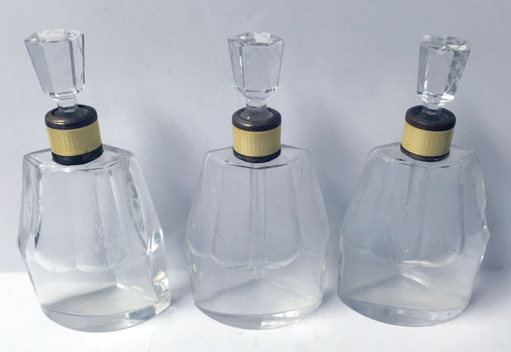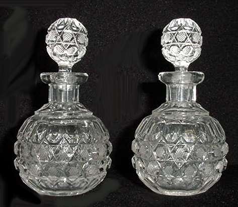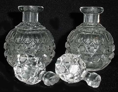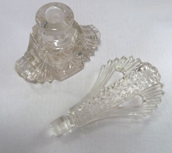 This is a lovely pair of cut crystal perfume bottles ... excellent condition with the exception of stoppers ... each has been broken below the neck. Otherwise perfect ... (Click on pic for more photos.) |