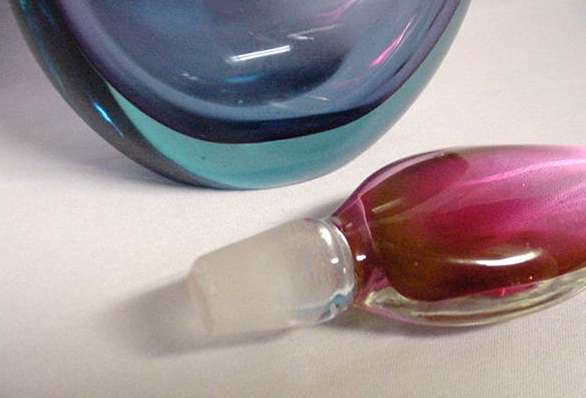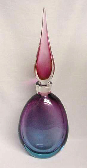 This beautiful art glass cologne decanter has colors shading from fuchsia pink to purple to teal blue. It is absolutely fabulous! Polished bottom, ground stopper. Quite heavy and in excellent condition with no chips or cracks. Stands 15-1/2" high to top of stopper. Bottle is 8-1/2" high and approximately 5" wide. (Click on pic for more photos.) |
