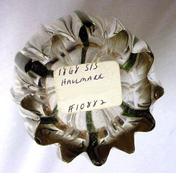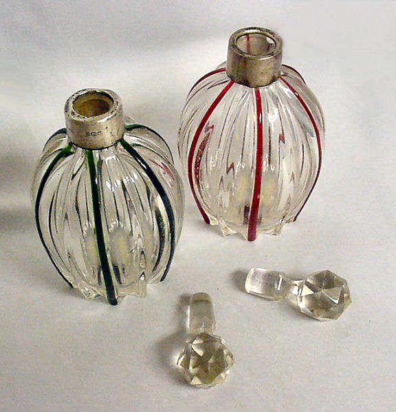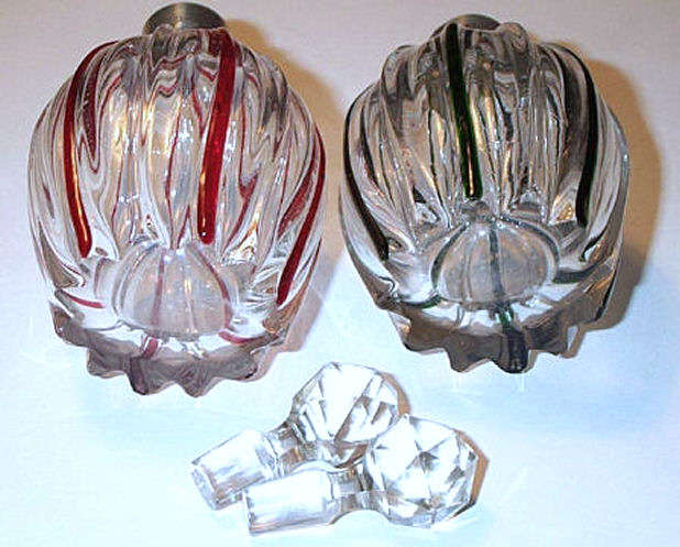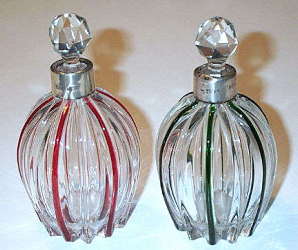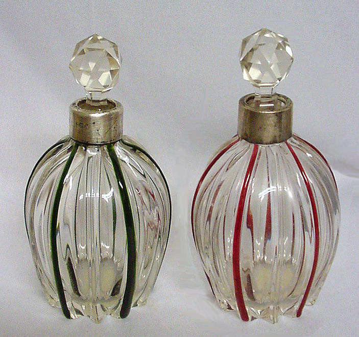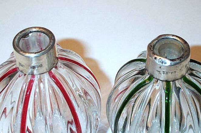 Pair of beautiful perfume bottles with applied colored stripes, hand-ground stoppers custom fit to each bottle (not interchangeable). sterling silver collar mounts, polished bottoms. Hallmarks date them to London 1867-1868. Fantastic condition especially considering their age! Bottle portion measures 3-78" high x almost 3" wide at widest part, OA height with stoppers is 5". (Click on pic for more photos.) |
