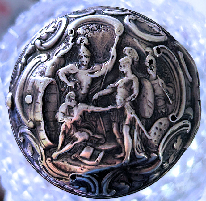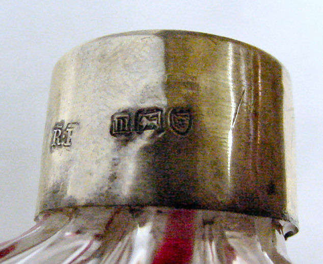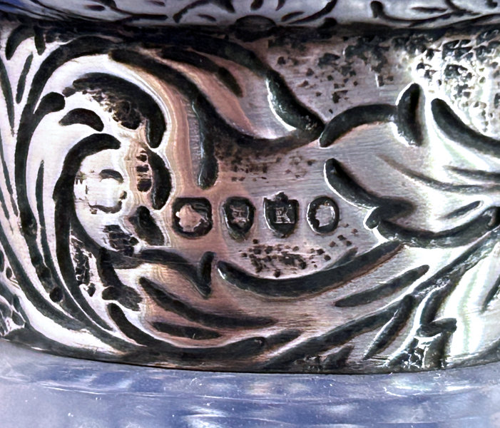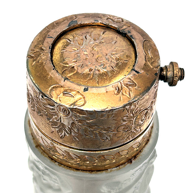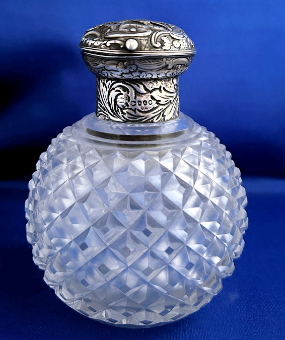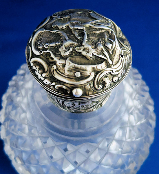 What a gorgeous perfume bottle this is! This is a fairly large bottle and has a heavy cut glass base. It is topped with a sterling silver repoussé cap which bears assay marks for London 1885 and depicts one of many scenes of Diogenes & Alexander (read more here). It has the original stopper inside which does have a few chips but seats nicely and still seals the bottle. Truly a gorgeous piece and one I feel sure you won't find anywhere else again! It measures 5" high and is 3-3/4" diameter. Other than the stopper, it is in excellent condition, especially for being 140 years old! (Click on pic for more photos.) |