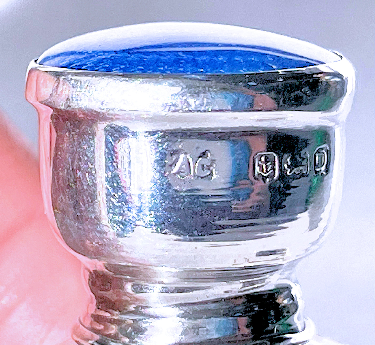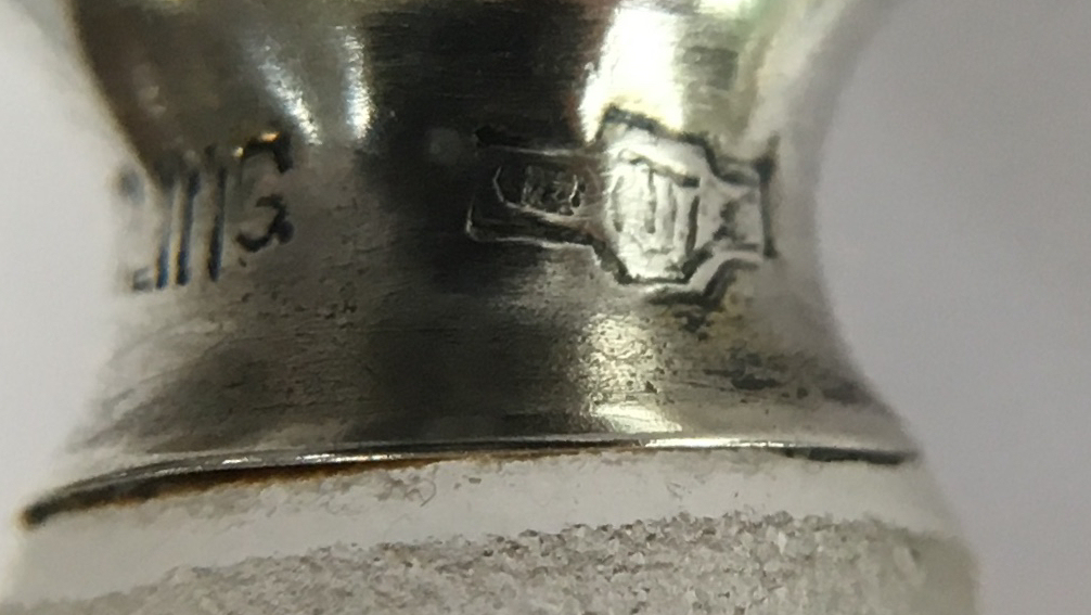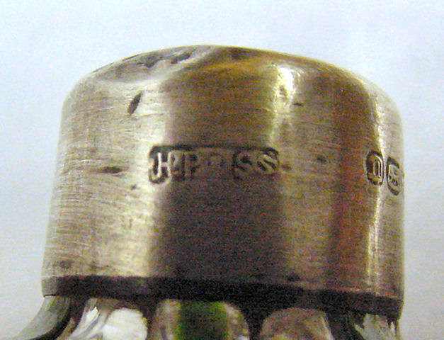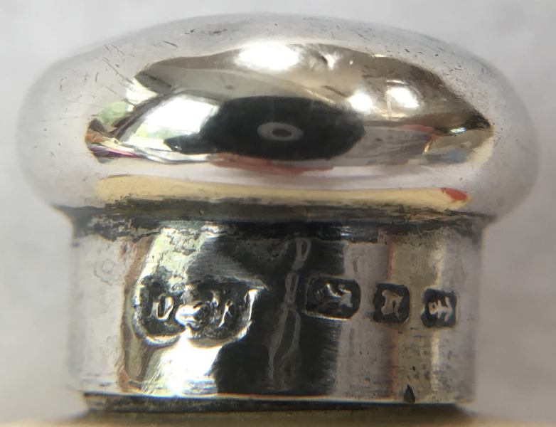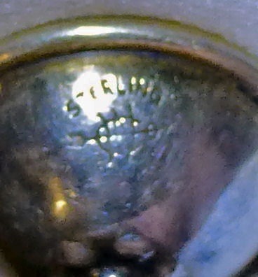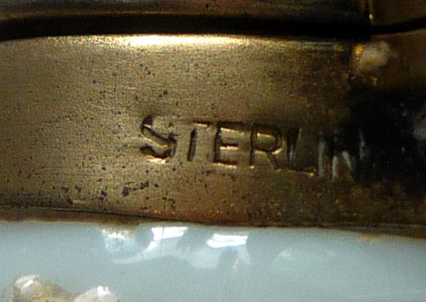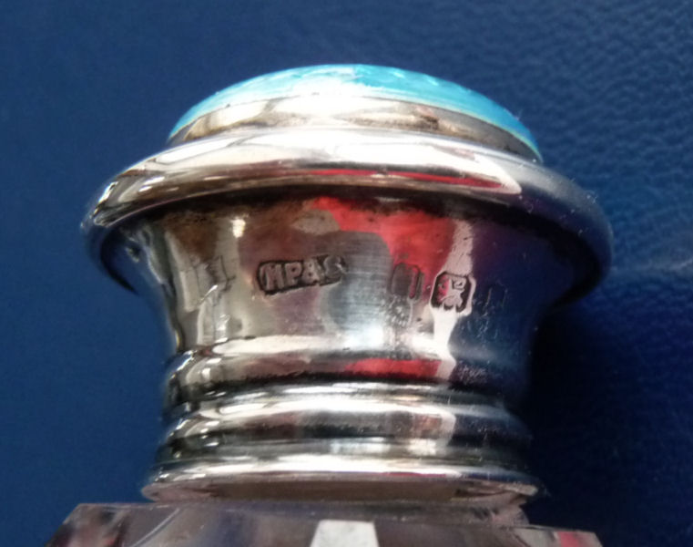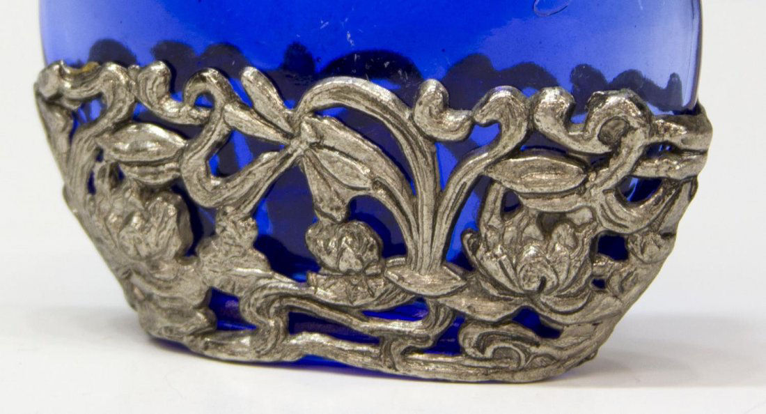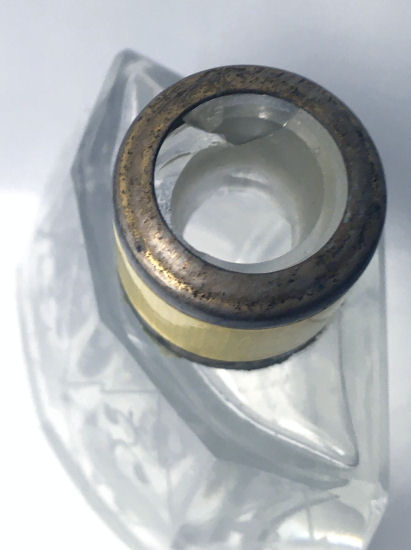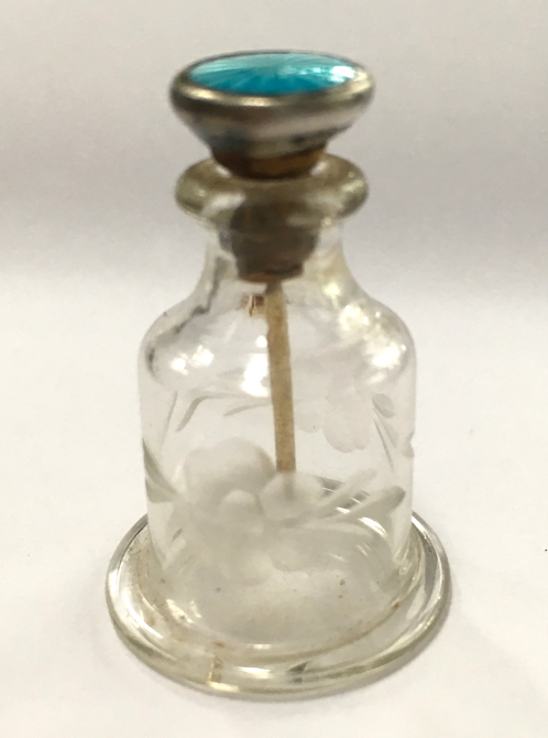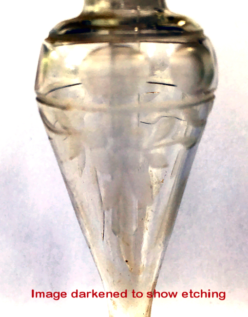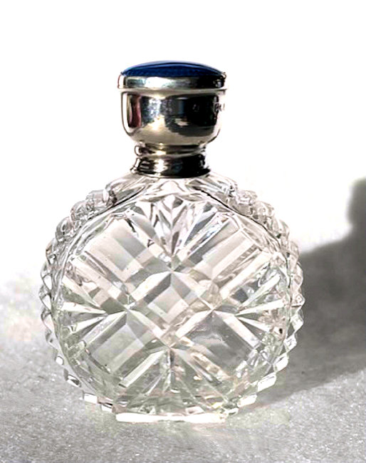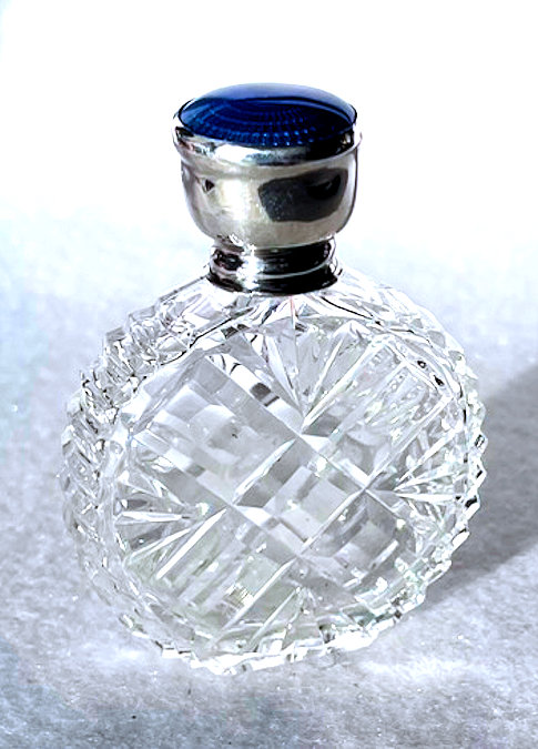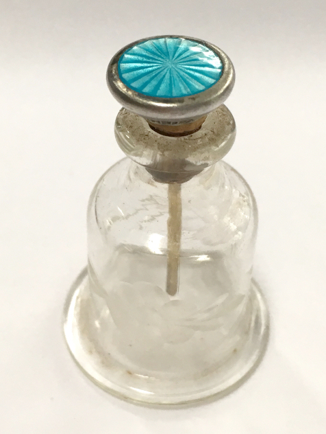 This adorable diminutive little perfume bottle will make the sweetest addition to your vanity! It is exquisitely etched with delicate flowers around the crystal bottle with a flanged base. The stopper is sterling silver with a soft radiant baby blue enamel guilloche top. The metal dauber is in excellent condition as is the entire bottle. There is one tiny spot of perfume on the inside that I have not tried to remove ... will leave that up to you. The cap is marked "STERLING" and a hallmark that I cannot identify.* This tiny little perfume measures only 1-1/4" high. The base is 7/8" diameter and the cap is about 3/8" diameter. It is a little jewel for sure! *According to Tom from Marks4Antiques, "Because it is so partially visible and practically indistinguishable, my best guess is for the French "crab" assay hallmark. This symbol was used by assayers in non-metropolitan areas of France to confirm the purity of silver. It was rather generic and many items bearing this symbol usually did not have a maker's mark since most were made for others as parts to a larger piece (as in this case). Also, the French are renowned for their glass & crystal production, so this theory makes sense. The only other possibility, in my opinion, is that it was made in Austria. In either case, the safest way to attribute the origin of this item is to call it 'Continental European'. I would date it to around 1890s - 1920s." (Click on pic for more photos.) |