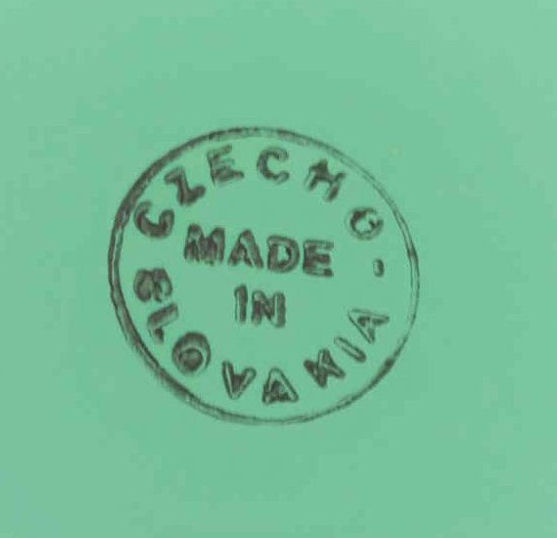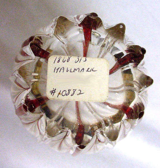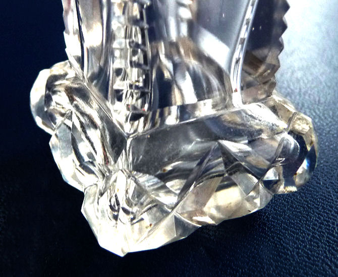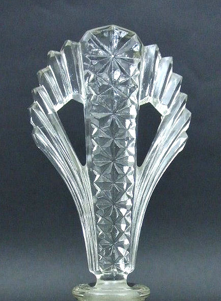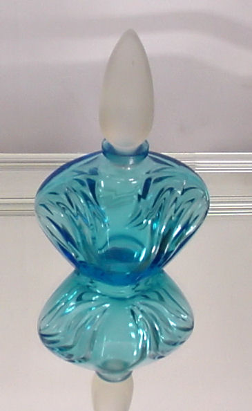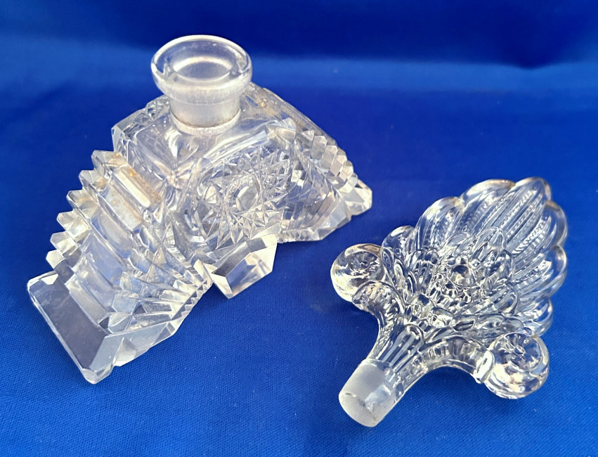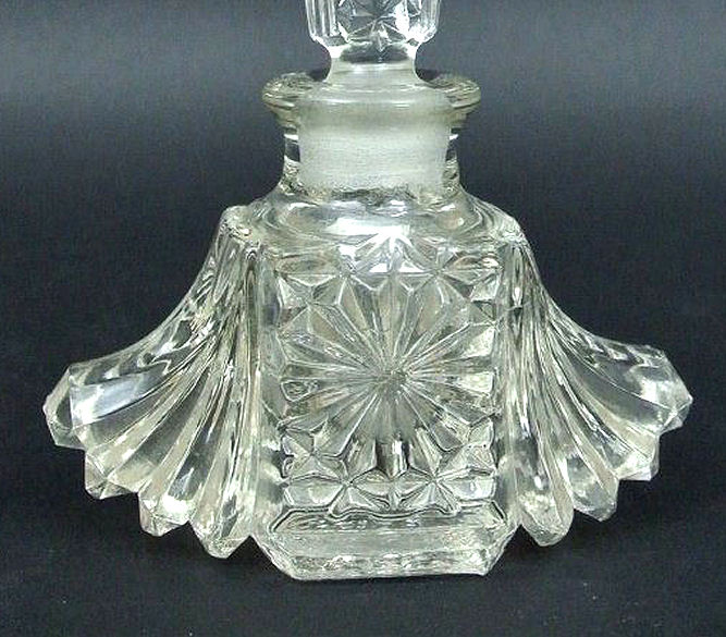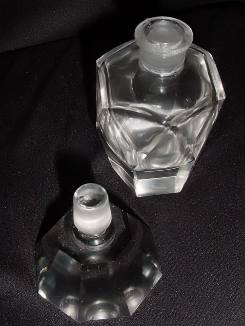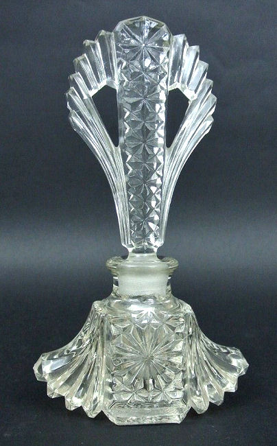 This very lovely perfume bottle has a facet cut glass base and a pressed glass van shaped stopper (I believe the stopper is a replacement but can't swear to it). It has an acid stamp on the bottom which reads "Made in Czechoslovakia" and it is in excellent condition. It is quite the showstopper! This beautiful bottle stands 7" high x 4-1/2" x 1-5/8" overall. (Click on pic for more photos.) |