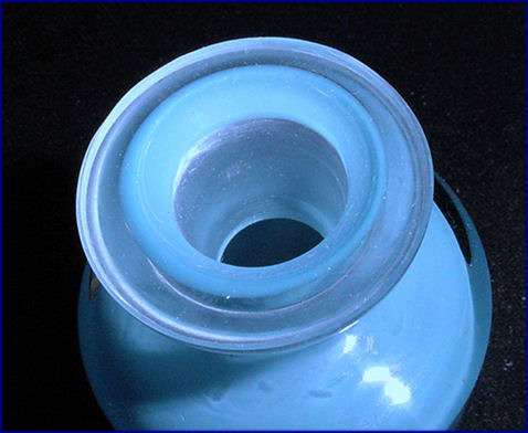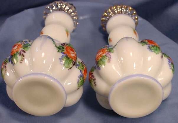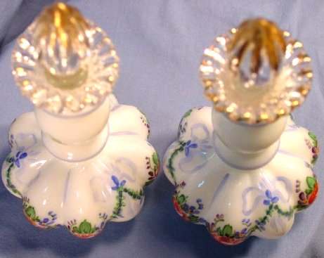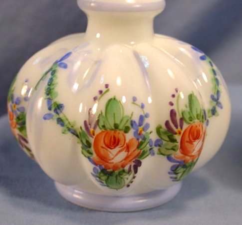 Although the picture shows a pair, one of them has been sold. Made by Fenton, it is done in their Charleton design which features hand-painted roses. Added to this charm are blue ribbons tied in bows giving it a Victorian look. The ruffled neck and stopper is trimmed in gold. Excellent condition with exception of a slight air bubble chip on bottom of stopper. Measures 7" tall to tip. (Click on pic for more photos.) |