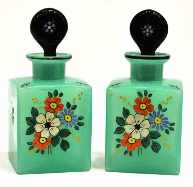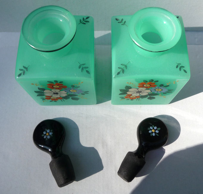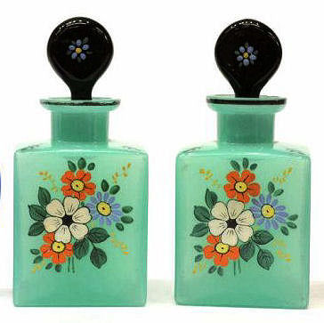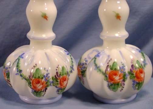 This is a beautiful pair of antique barber bottles with hand-painted flowers on blue satin glass. The porcelain tops are figural birds whose beaks have a hinged metal top that opens to pour. The bottles and tops are in perfect condition ... the hand-painted flowers show some wear as appropriate to age. Bottles measure 7-1/4" high to top of neck, 9-3/4" high to top of bird's head. (Click on pic for more photos.) |