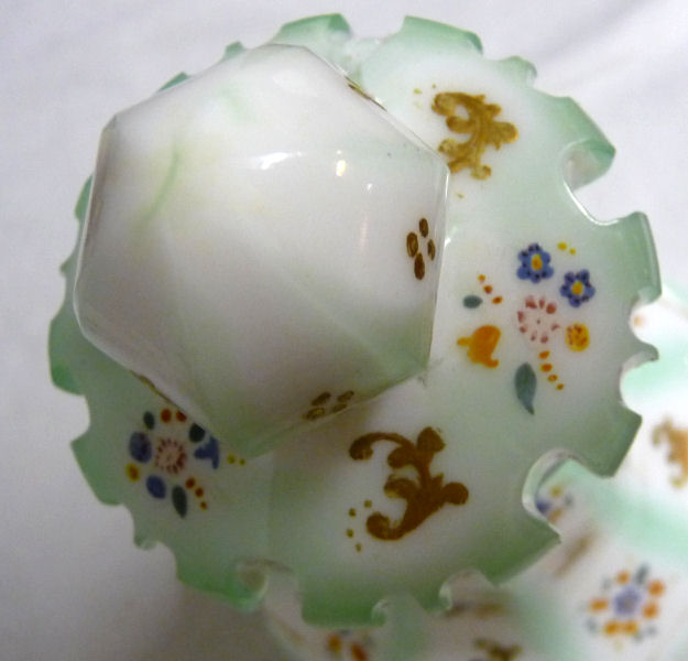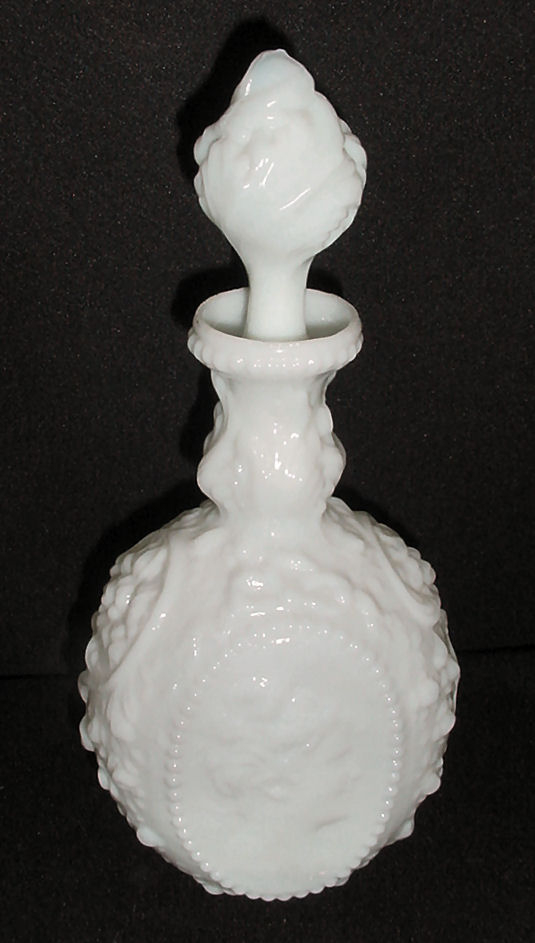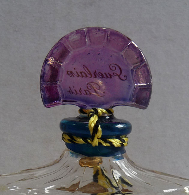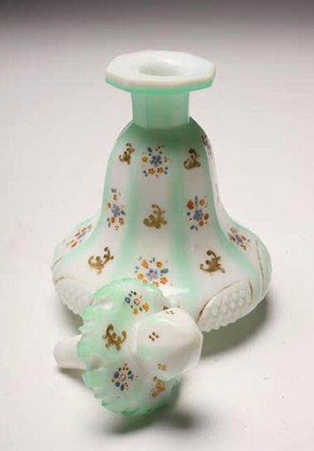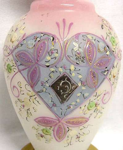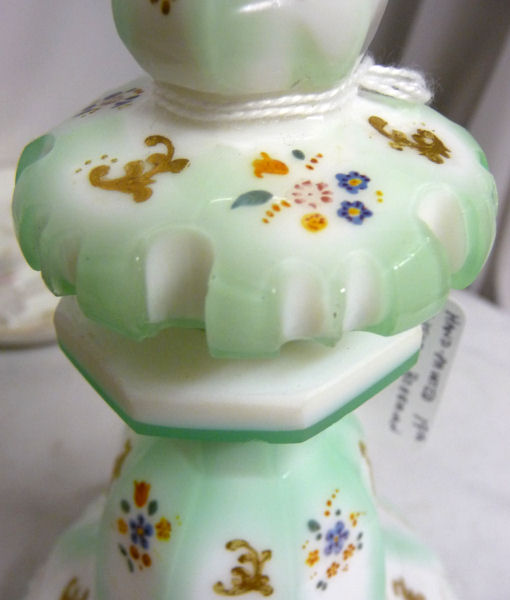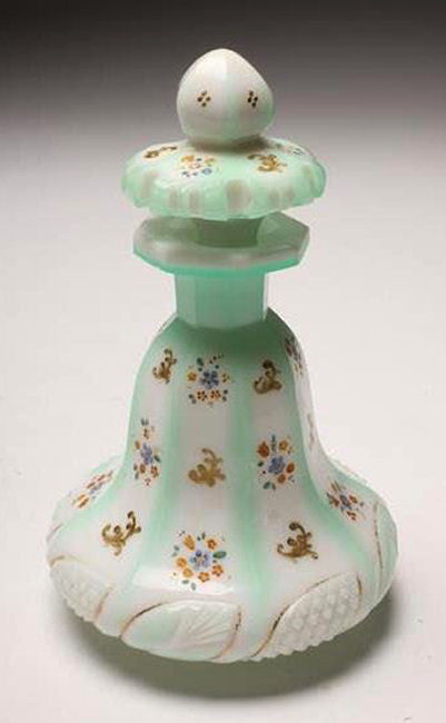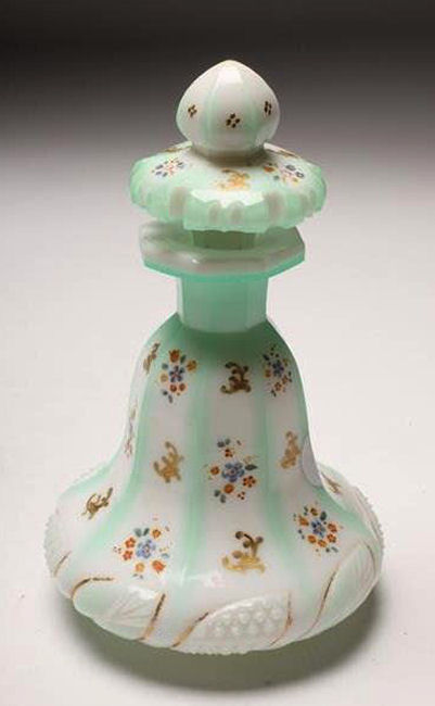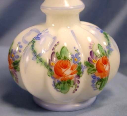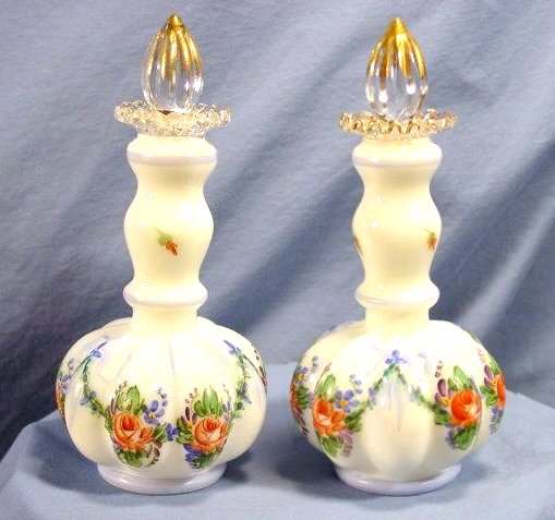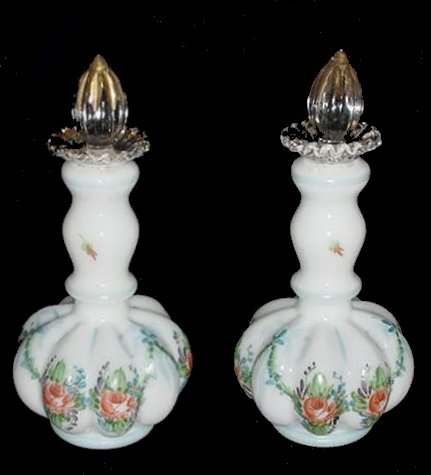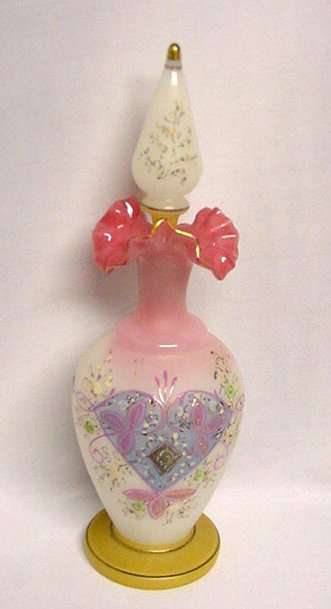 Gorgeous colors on this one! Lavender, periwinkle blue, pale green, ivory and black center on a white/pink/gold bottle with a deep peach crimped neck. The stopper has matching enameling on it as well. This is a truly exquisite piece ... may end up in my own collection as I love it that much! Found in my travels on a recent trip to Delaware ....Large size ... measures 11-1/2" tall to top of stopper and 3-1/2" diameter at widest portion. Perfect condition! This dates from the 1800's when ladies used to purchase large amounts of perfume and keep it in these beautiful bottles on their dressers. They would take this bottle back to the store for refills when they ran out. Smaller perfume bottles came into vogue in the 20th century. (Click on pic for more photos.) |