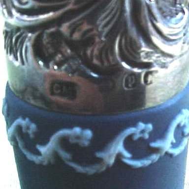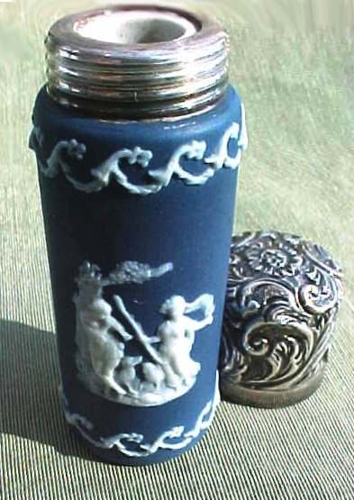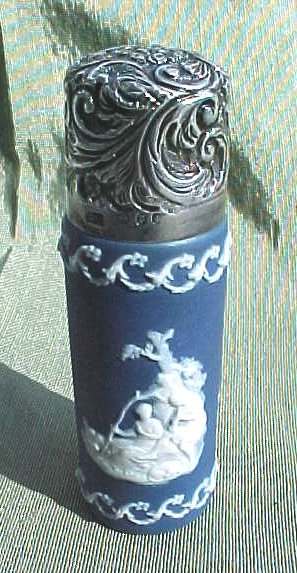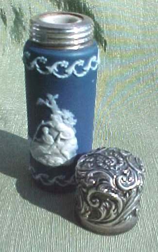 Lovely unmarked Wedgwood blue jasperware perfume with ornate English sterling silver repousse' top hallmarked for Birmingham, 1889. Features two classical Wedgwood scenes with couples in 18th century costumes in landscapes with dogs and sheep. Cylindrical bottle measures 3-1/4" tall x 1" diameter. Screw top has cork liner to seal. (Click on pic for more photos.) |