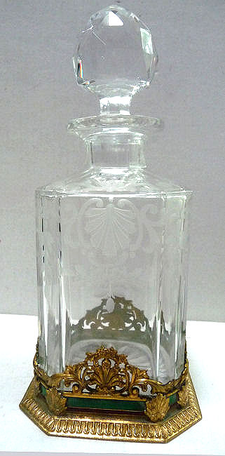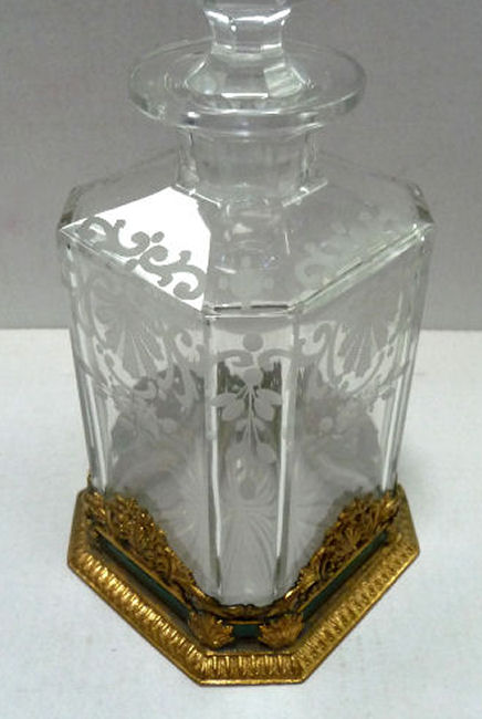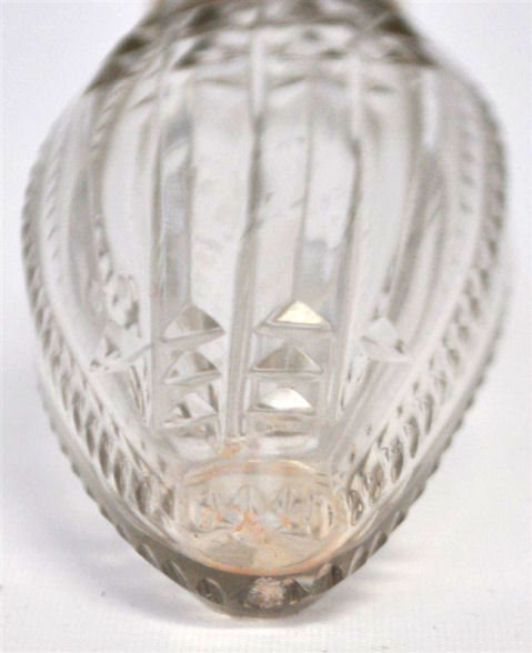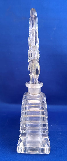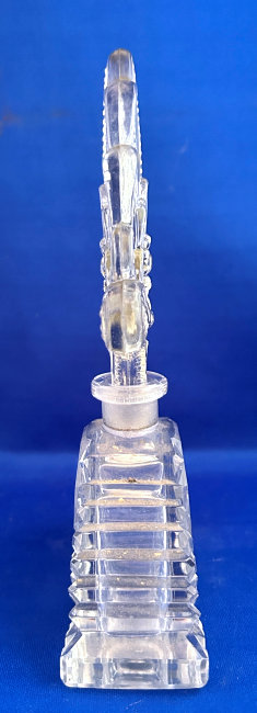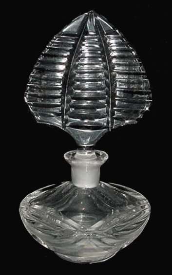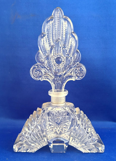 Gorgeous cut glass perfume with Egyptian influence ... stopper is shaped like a pyramid. Excellent Condition with no chips or cracks. Measures 5-1/4" high x 3" wide. (Click on pic for more photos.) |