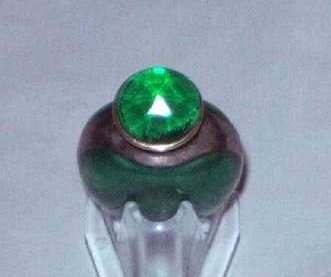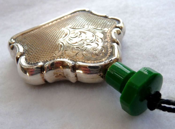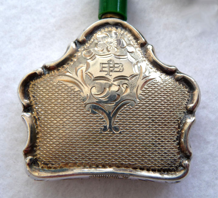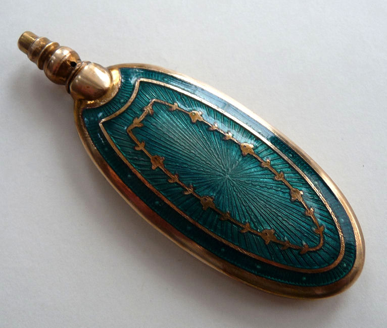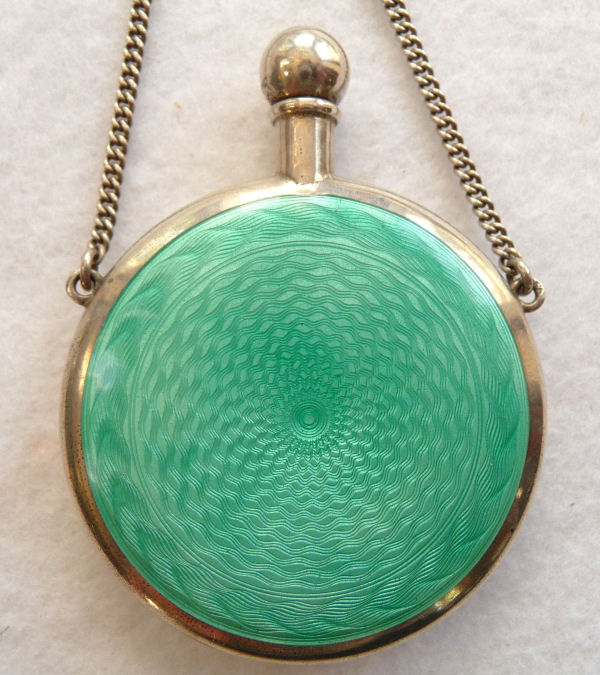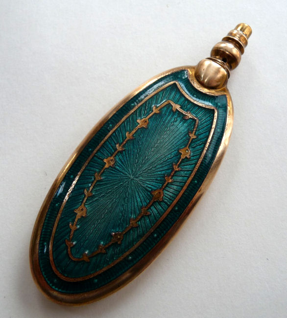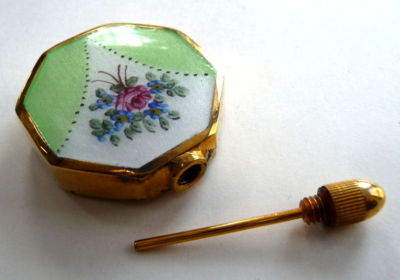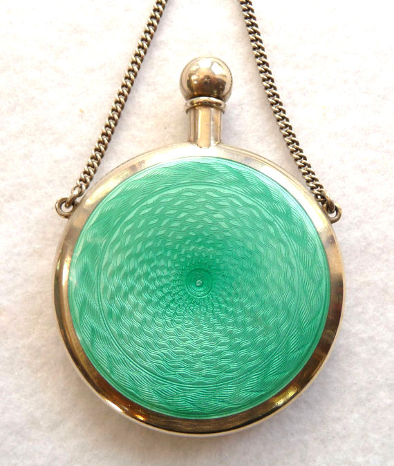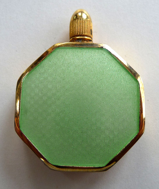 Rich emerald green enamel guilloche vinaigrette with shell design ... bottom of piece has three tiny holes for scent to escape. Jeweled cap twists off and there is a cotton pad inside to saturate with your favorite scent. Both sides are identical. Base metal appears to be silver but I have not tested it yet and there are no markings, so it may be silverplate. Condition is excellent ... no chips or cracks or wear to enameling. Measures 1-1/2" wide x 2-3/8" high overall. (Click on pic for more photos.) |