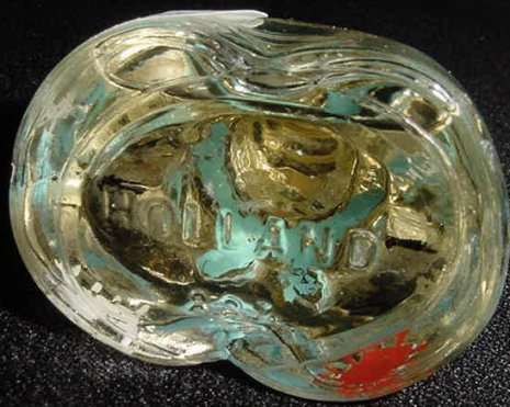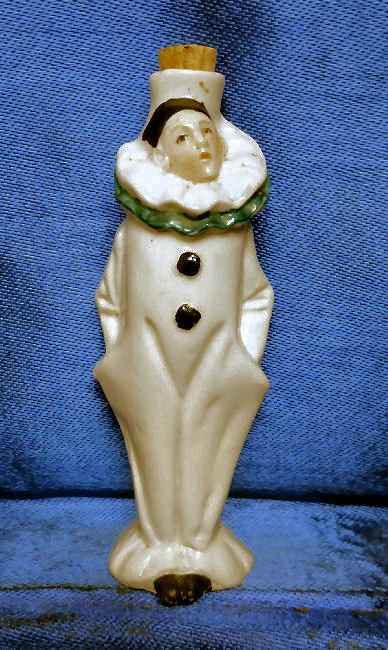 Cute little novelty figural perfume bottle made in Holland (see base pic below). Enameled colors on clear glass show only very minimal wear ... filled with a pale liquid (no scent ... I think it is colored water but this is how I bought it, so I am not sure). Measures 3" tall x 1-1/2" wide. (Click on pic for more photos.) |