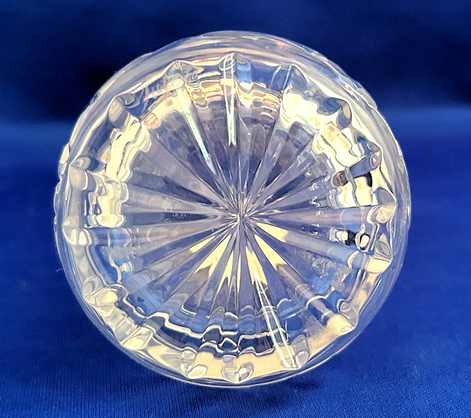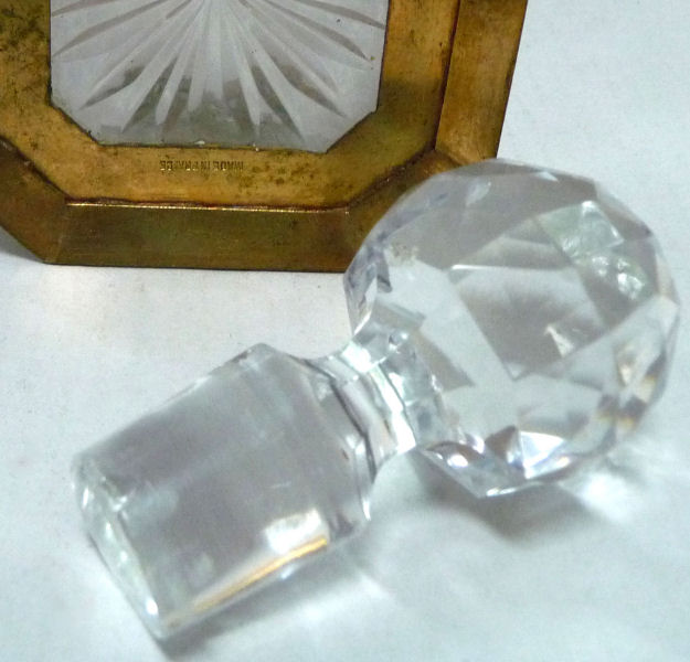Nice faceted crystal perfume bottle, unmarked. Condition very good overall with one tiny fleabite chip on neck of bottle, almost impossible to see unless lid is removed. Measures 2-1/2" diameter 5" high. (Click on pic for more photos.) |