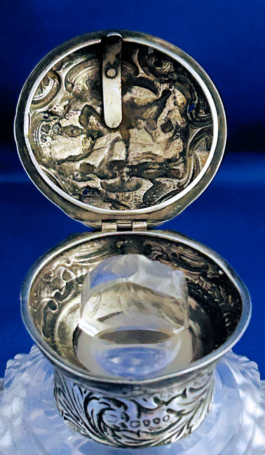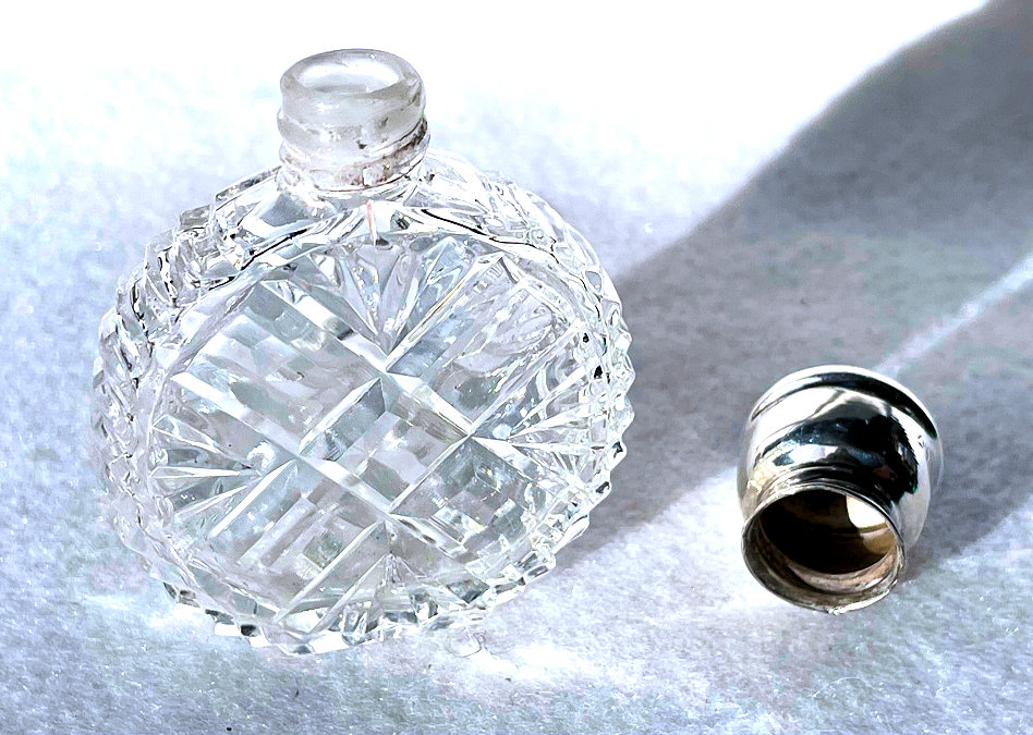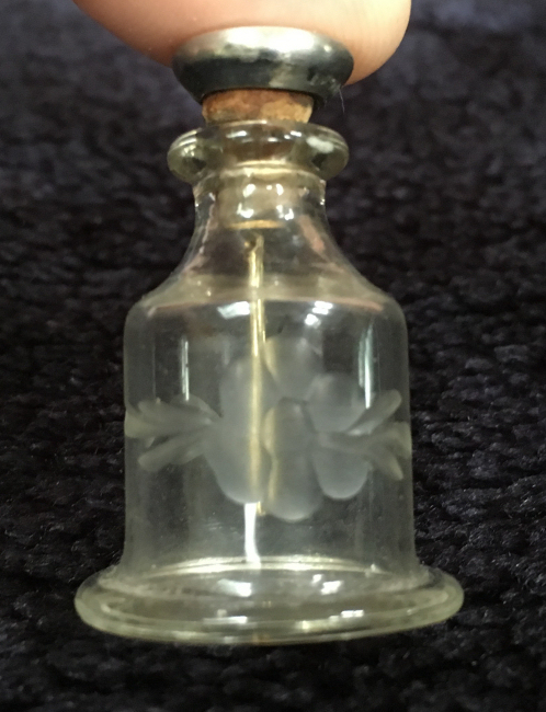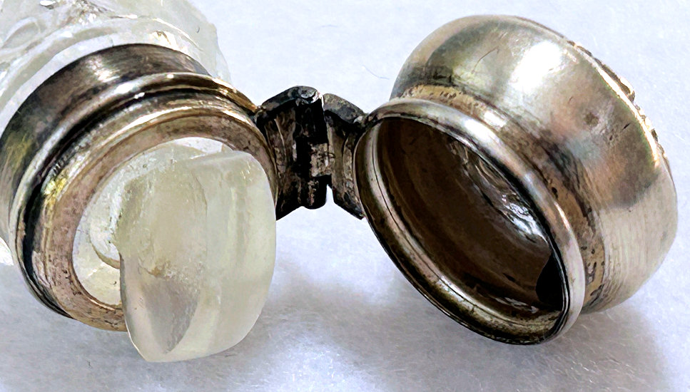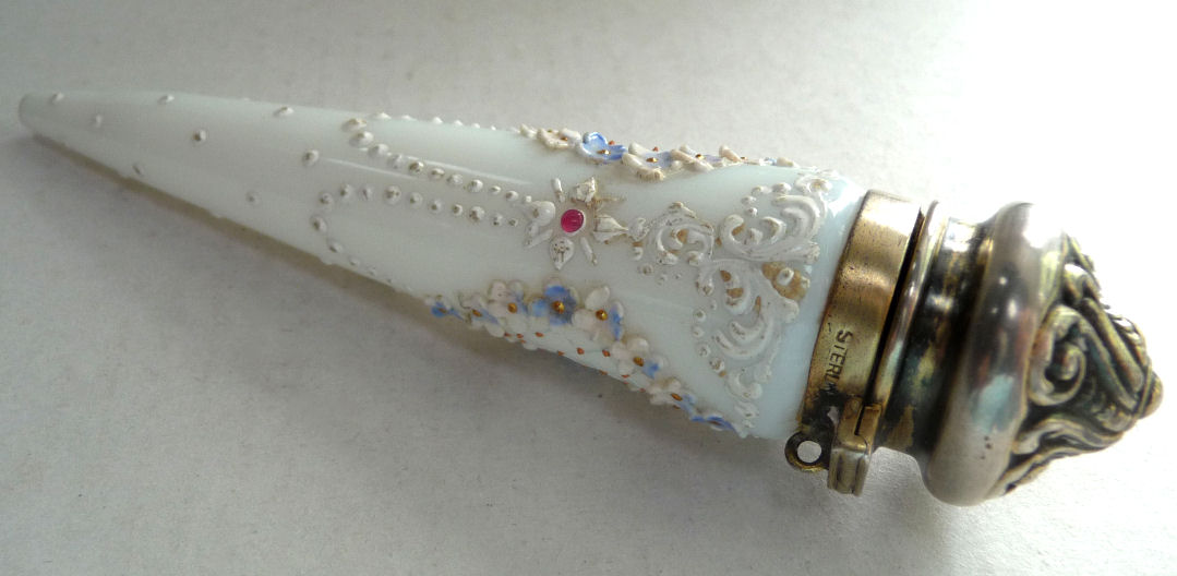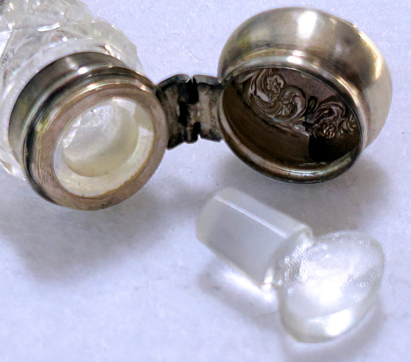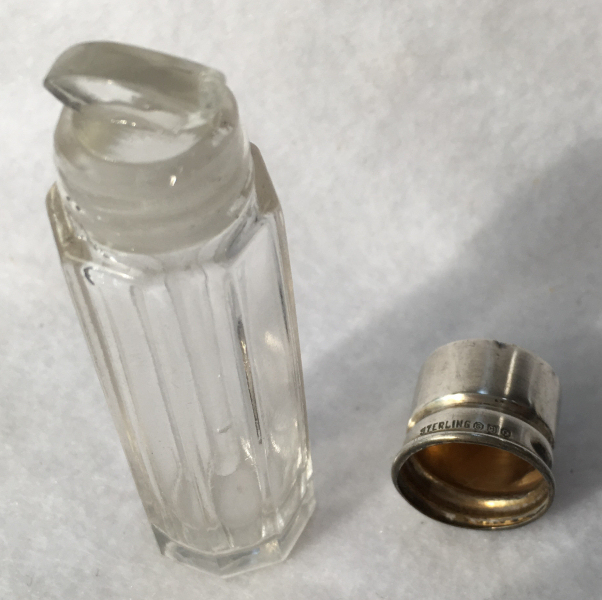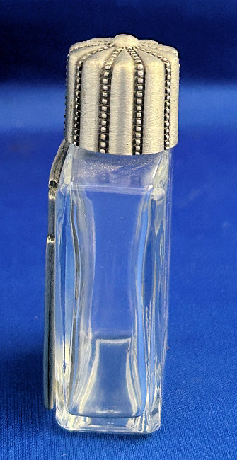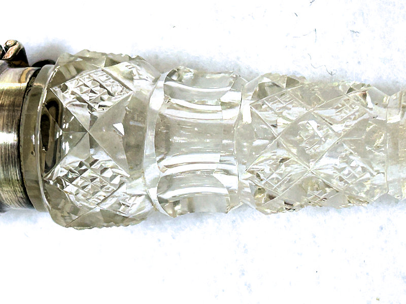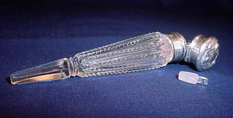 Here we have a beautiful cut crystal zipper design perfume with sterling silver repousse' lid. Lid snaps closed tightly and has a tiny ring to attach to a chatelaine. There is also a tiny ground glass stopper inside to seal the perfume. Beautiful piece! Measures almost 3-3/4" long. (Click on pic for more photos.) |