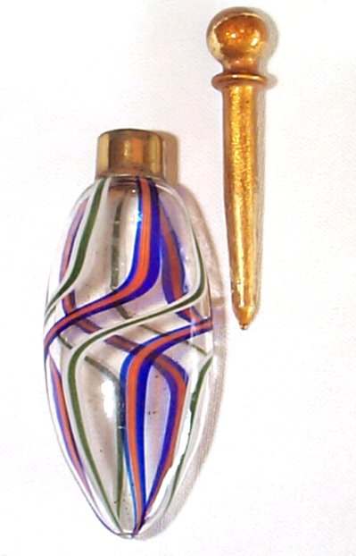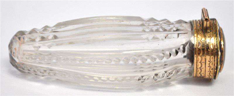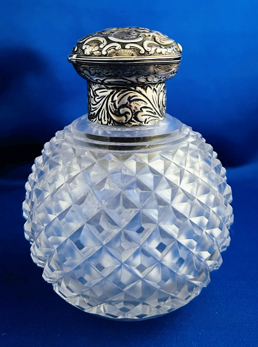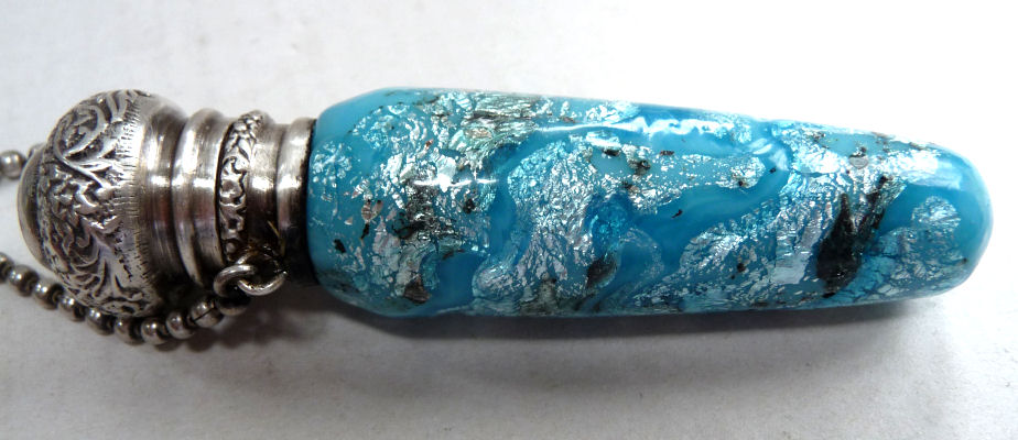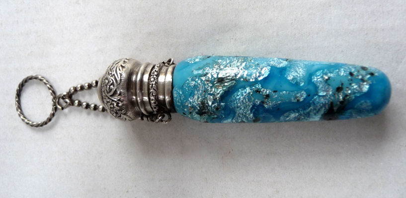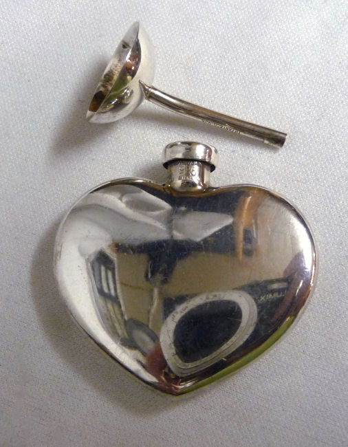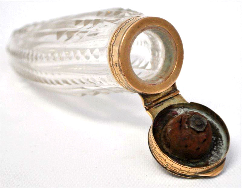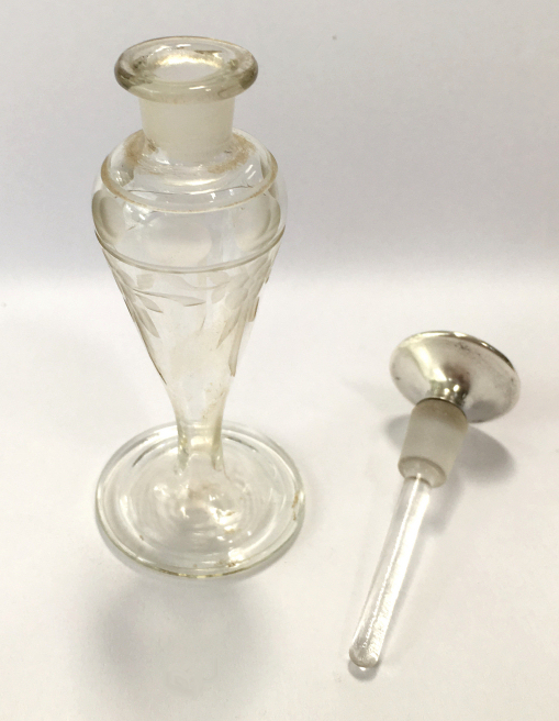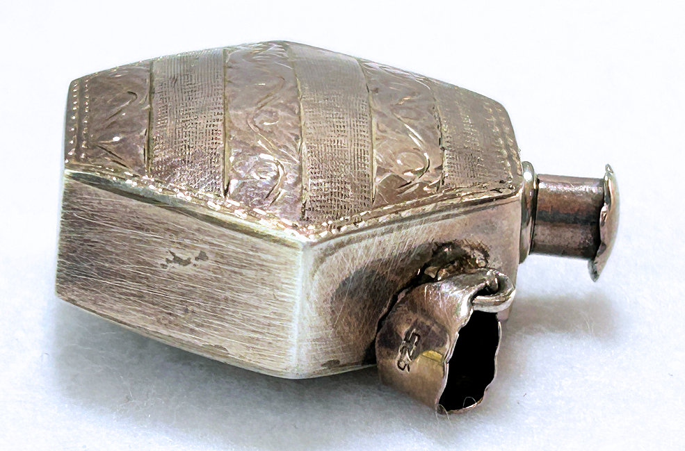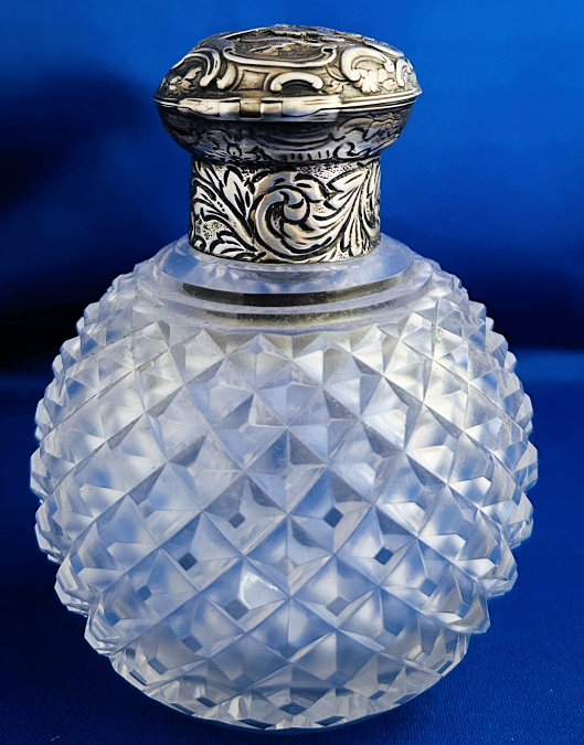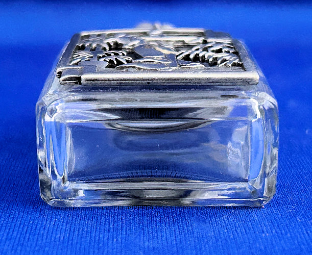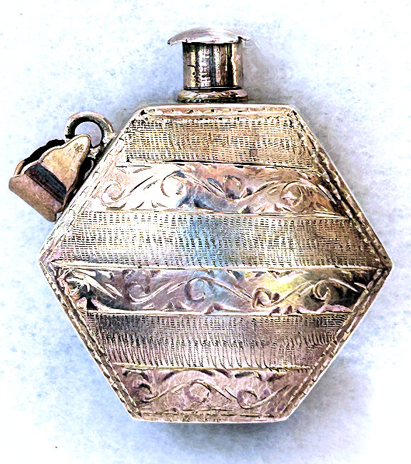 Here we have a beautiful cut crystal zipper design perfume with sterling silver repousse' lid. Lid snaps closed tightly and has a tiny ring to attach to a chatelaine. There is also a tiny ground glass stopper inside to seal the perfume. Beautiful piece! Measures almost 3-3/4" long. (Click on pic for more photos.) |