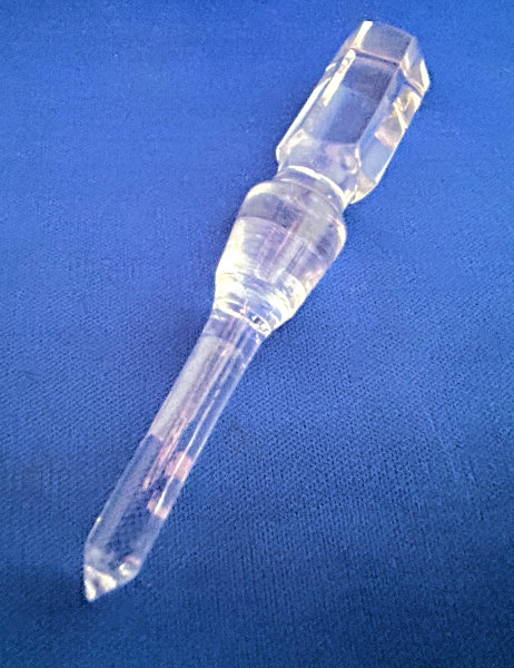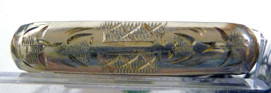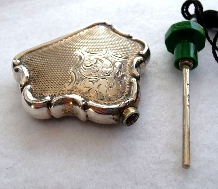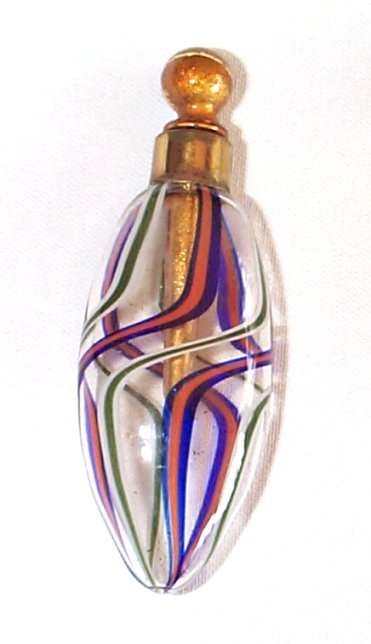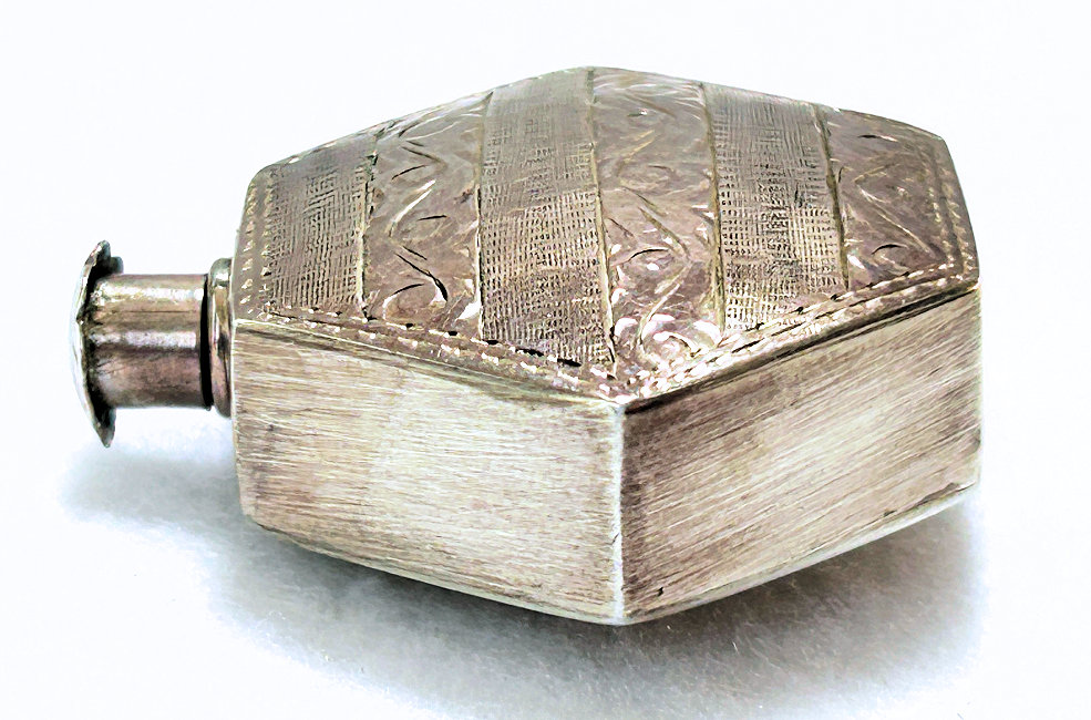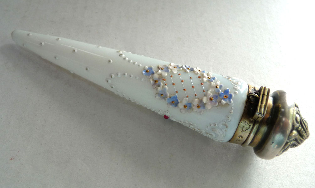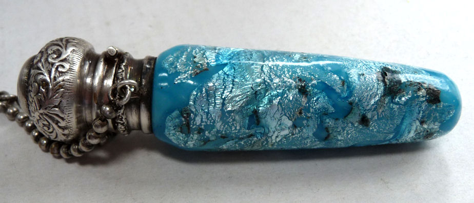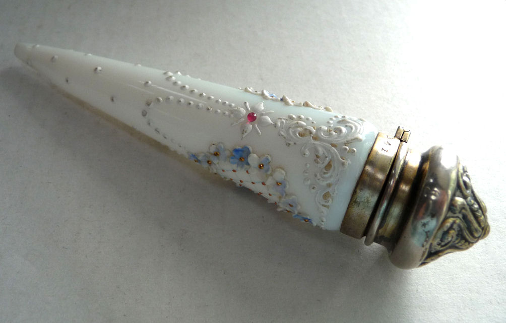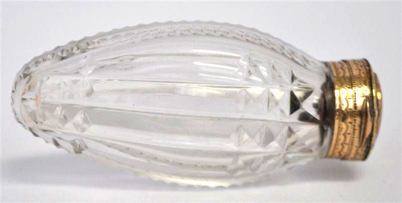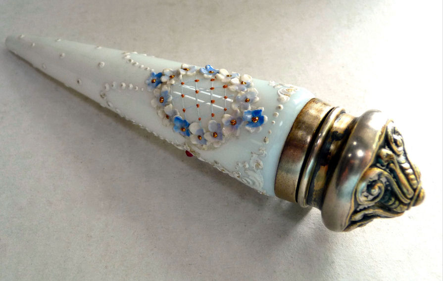 Here we have a beautiful cut crystal zipper design perfume with sterling silver repousse' lid. Lid snaps closed tightly and has a tiny ring to attach to a chatelaine. There is also a tiny ground glass stopper inside to seal the perfume. Beautiful piece! Measures almost 3-3/4" long. (Click on pic for more photos.) |