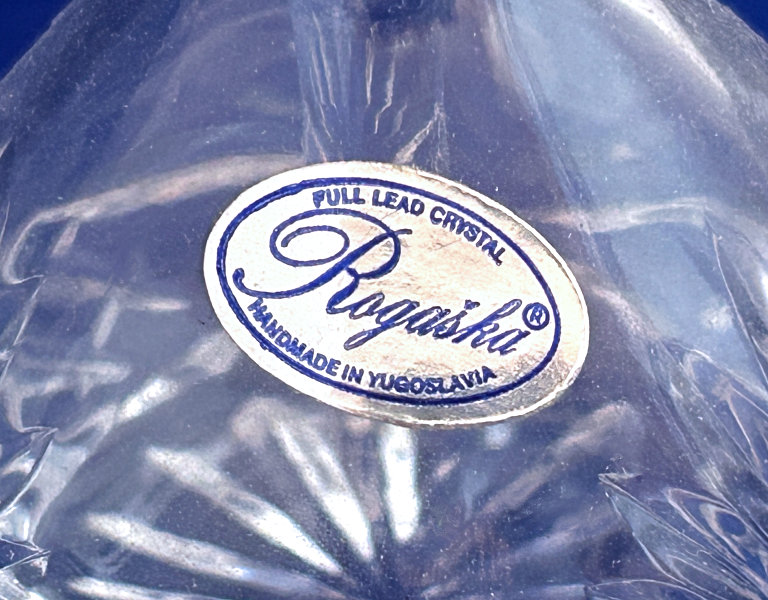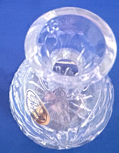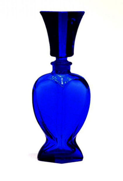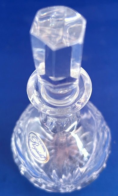 Handmade in Yugoslavia of lead crystal, this gorgeous little perfume bottle still has its original silver foil label on the side. It is so pretty and is the perfect size to tuck onto a vanity or dresser. In excellent condition with no chips, cracks or apologies, it measures 4-7/8" high x 2-1/2" diameter overall. (Click on pic for more photos.) |