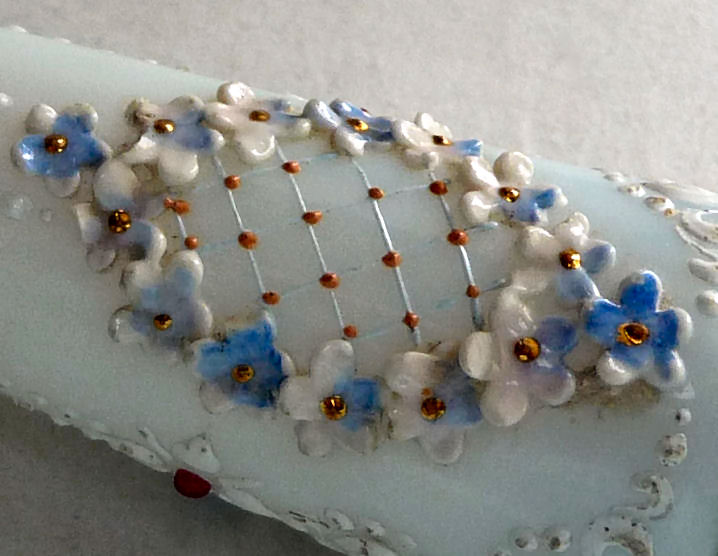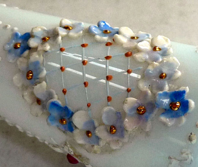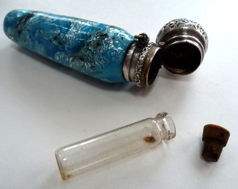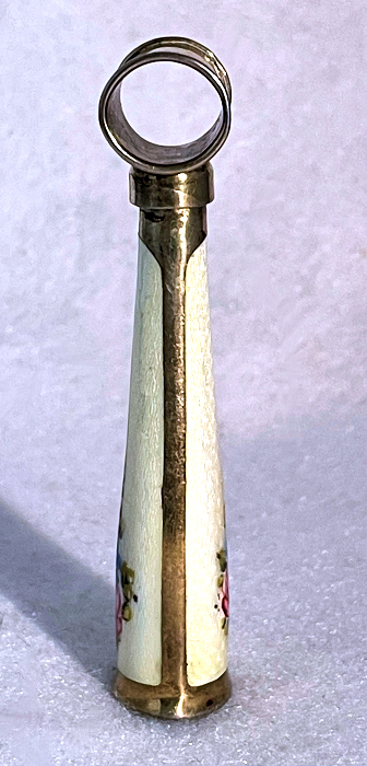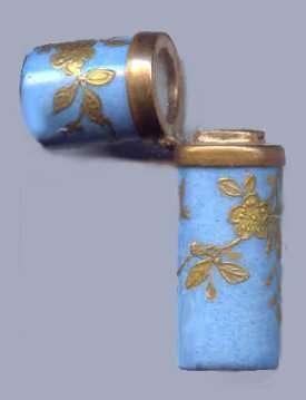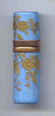 This is a beautiful perfume for carrying in your purse. It is made of porcelain with a blue overlay decorated with hand-applied gold gilt flowers that resemble dogwood or apple blossoms. The lid is hinged and snaps closed tightly. Original stopper is gone but was probably cork and I believe I have a replacement that will fit. Measures 2-1/2" long x almost 3/4" diameter. Top of lid has a gold flower as well. Very pretty and in excellent condition! (Click on pic for more photos.) |