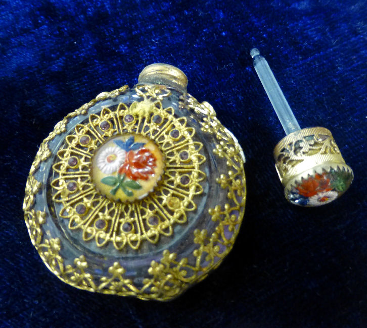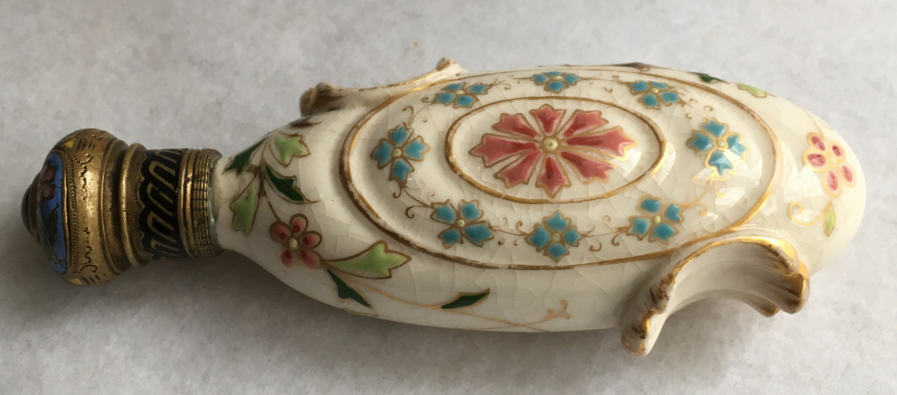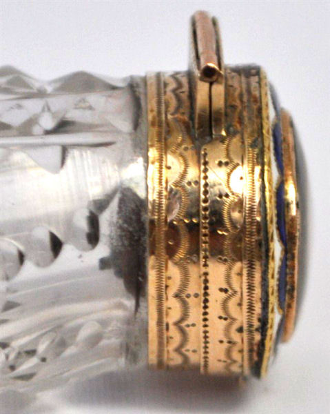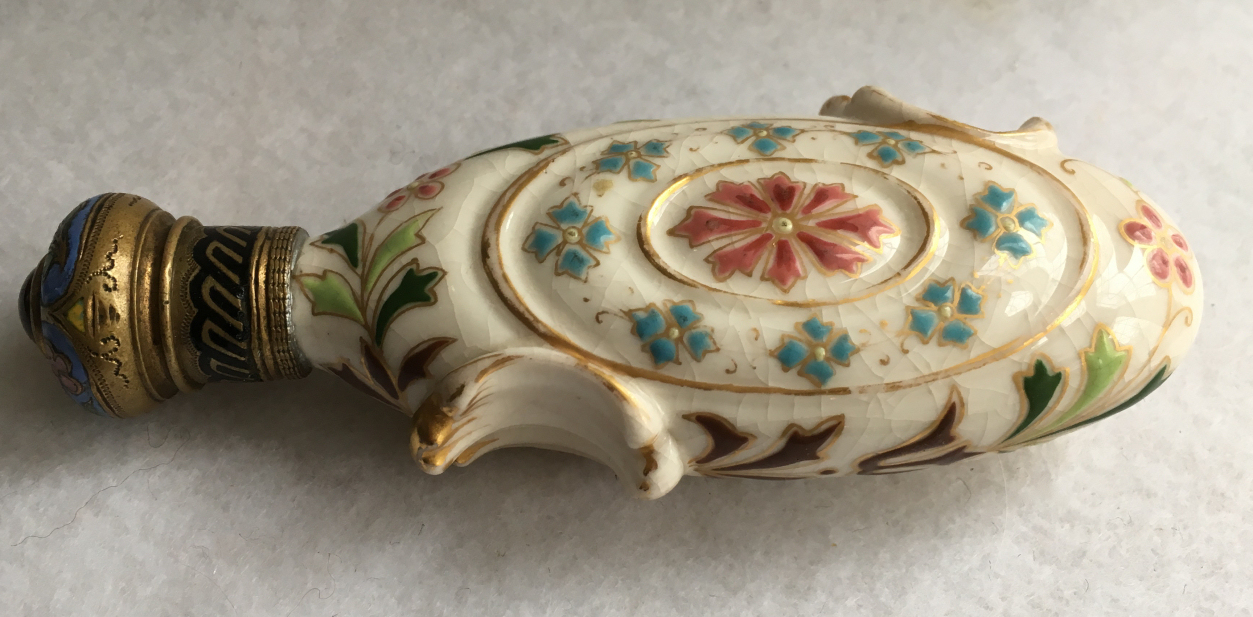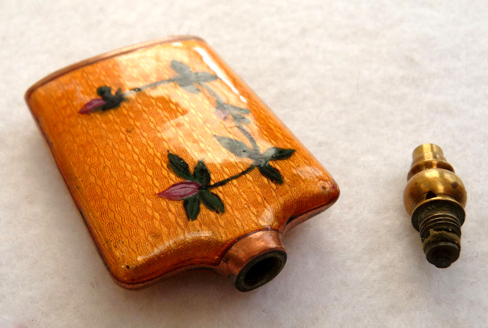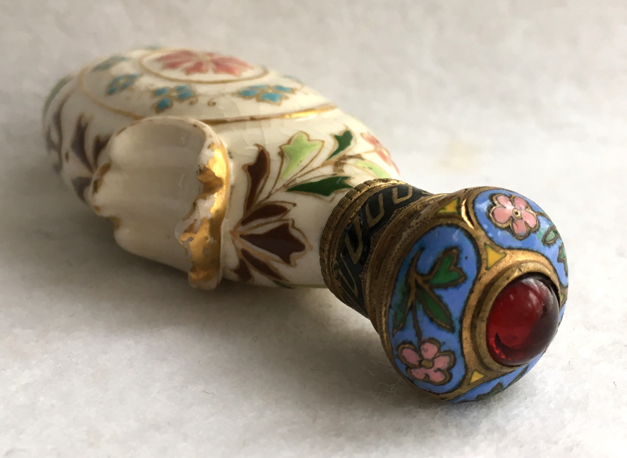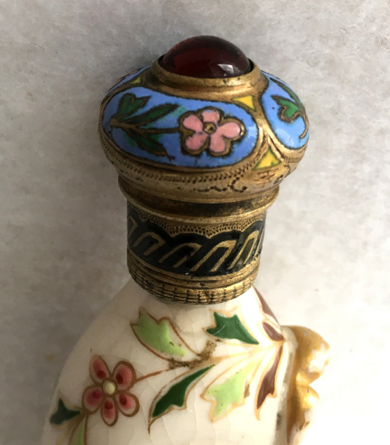 I just love the delicate details on this lovely early perfume with its extraordinary jeweled cloisonné cap. Both front and back are basically the same with shaped finger holds molded into the sides. But each side is decorated differently. It is truly a unique piece and unlike any I have seen before. I am not sure of the age as there is no mark on it at all but I believe it is a very early piece, possibly as early as first half of the 19th century. The piece is crazed but not discolored in any way and to me this is like fine age marks and do not bother me whatsoever. The enamel and the gold trim are in excellent condition with the only loss being the tips of the gold on the sides where the finger holds are. The top of the cap is done in cloisonné with a ruby jewel on the very tip. The inside of the cap is set with cork which seals the bottle completely from leakage so it is totally usable. What a gorgeous piece! Be sure to look at all the pics to see how unique it truly is. Overall the piece measures 4-3/8" tall x 1-3/4" wide at the widest points (finger holds) by 1" deep when lying flat. First time offered! (Click on pic for more photos.) |